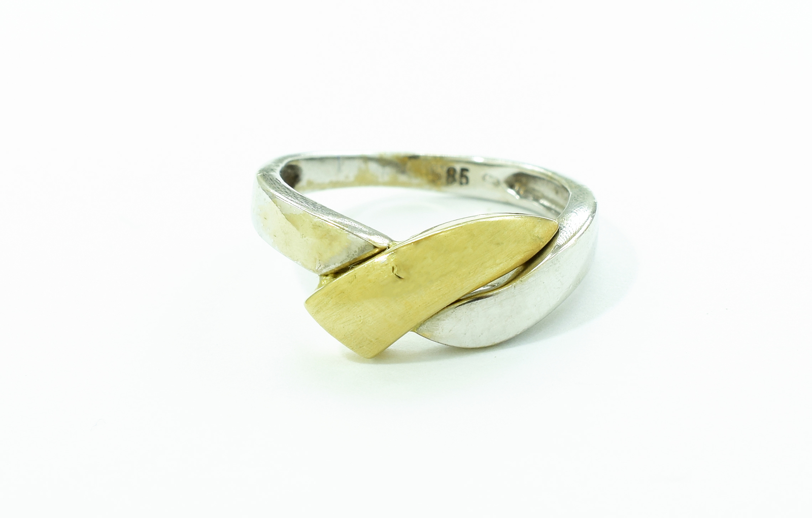 Dvě obroučky jsou propleteny přes sebe a tvoří jednoduchý křížený tvar bez kamene. Povrch je matný s jemným leskem na hranách.