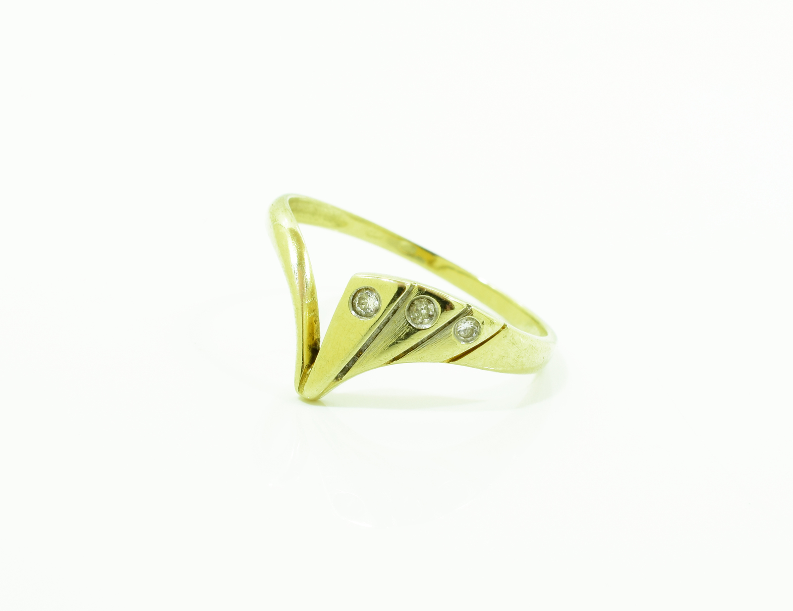 Dámský zlatý prsten ve tvaru špičky se třemi kulatými zirkony zasazenými diagonálně.