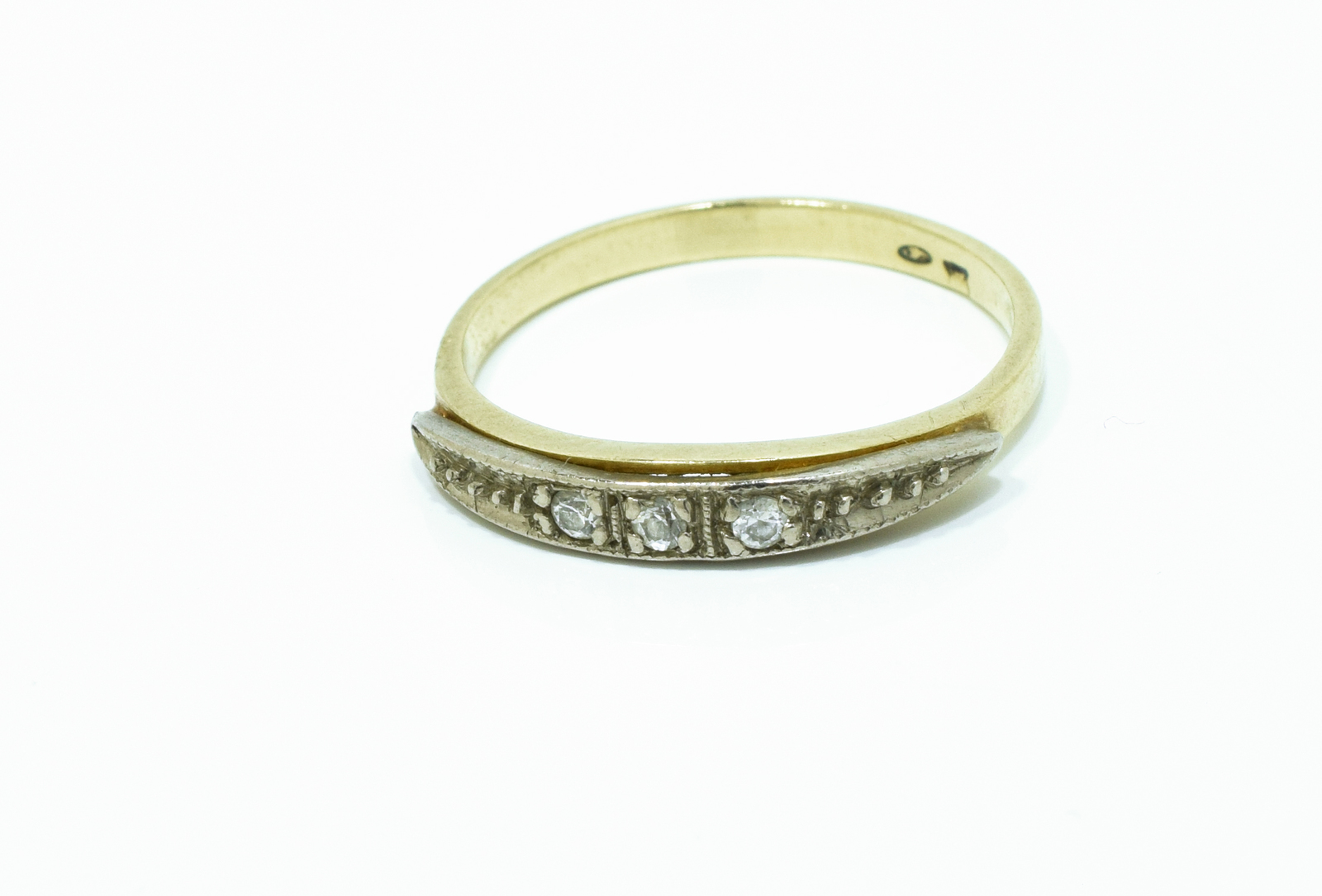 Přední část prstenu je tvořena bílým kovem, do kterého jsou zasazeny tři kulaté zirkony vedle sebe. Obroučka je hladká a jednoduchá.