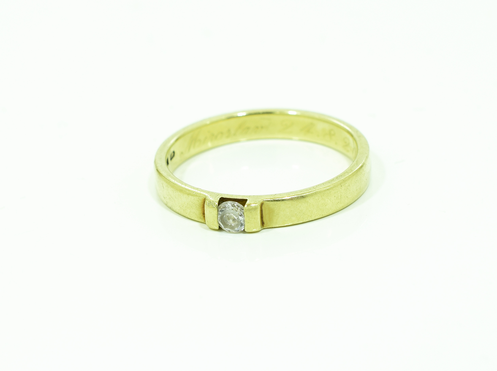 Zirkon je zasazený mezi dvěma malými výstupky, které ho pevně drží ze stran. Vnitřek obroučky je ozdoben rytým nápisem.