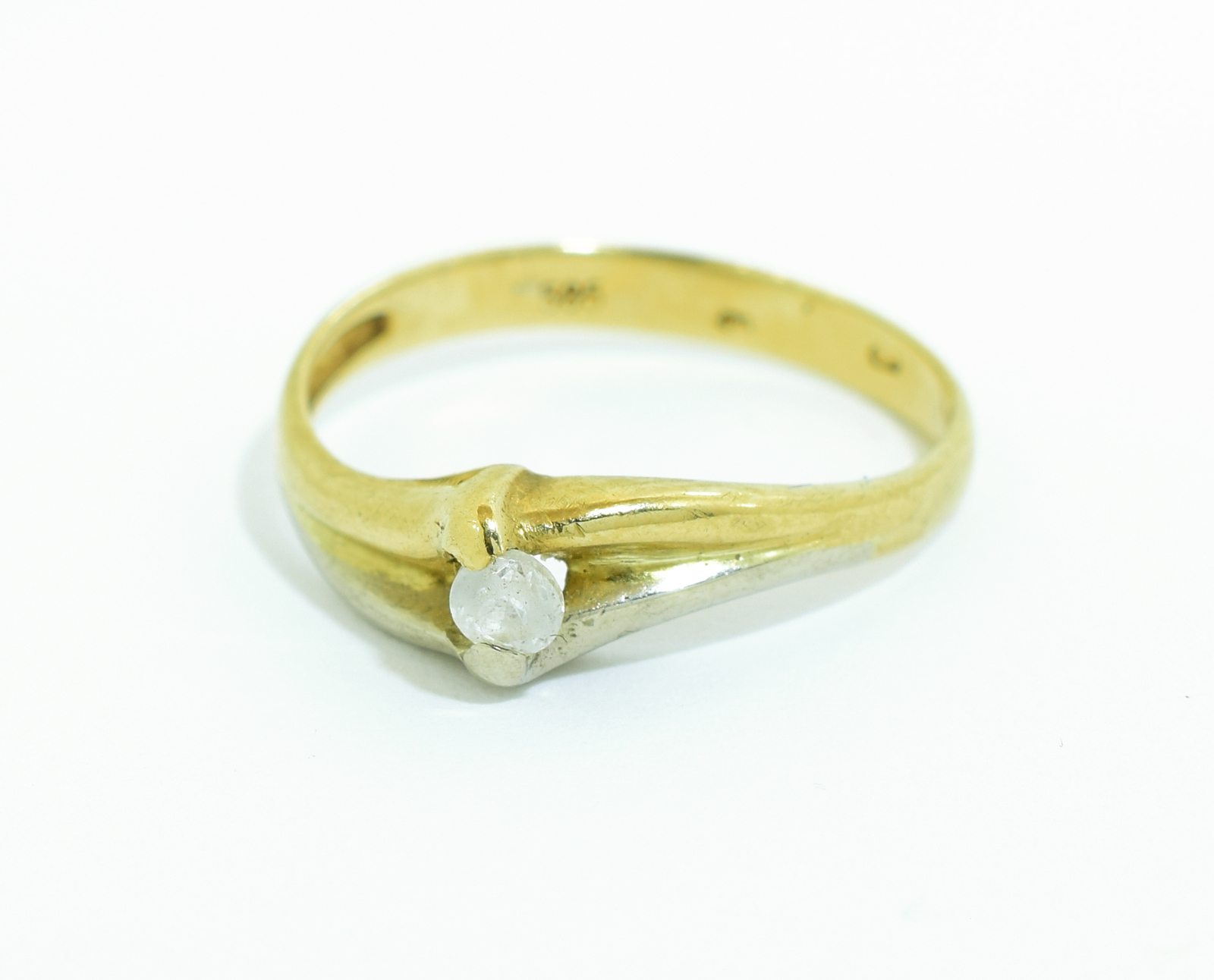 Dámský prsten ze žlutého zlata s malým bílým zirkonem uprostřed.