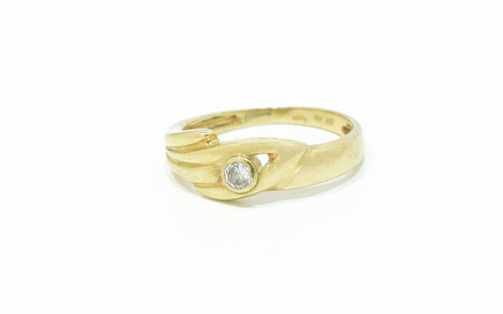 Dámský zlatý prsten ve žlutém zlatě s malým bílým zirkonem zasazeným uprostřed.