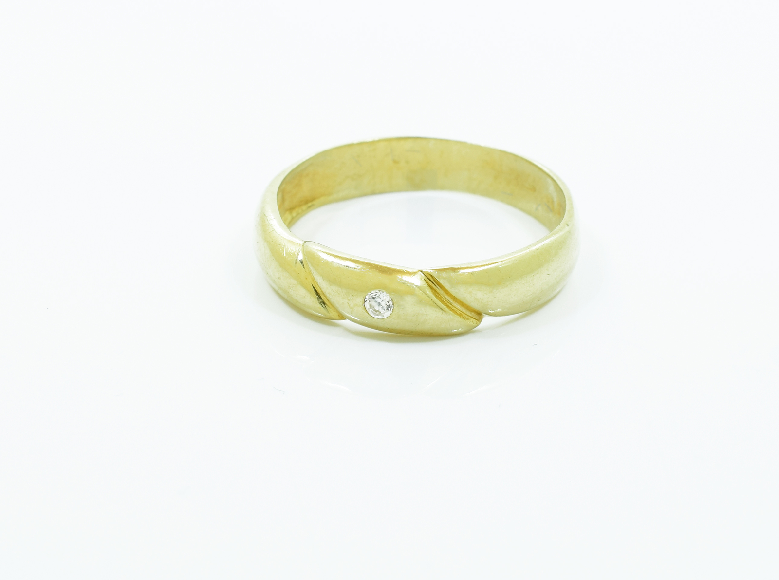 Zlatá obroučka ze žlutého zlata s malým bílým zirkonem uprostřed a šikmými výřezy.