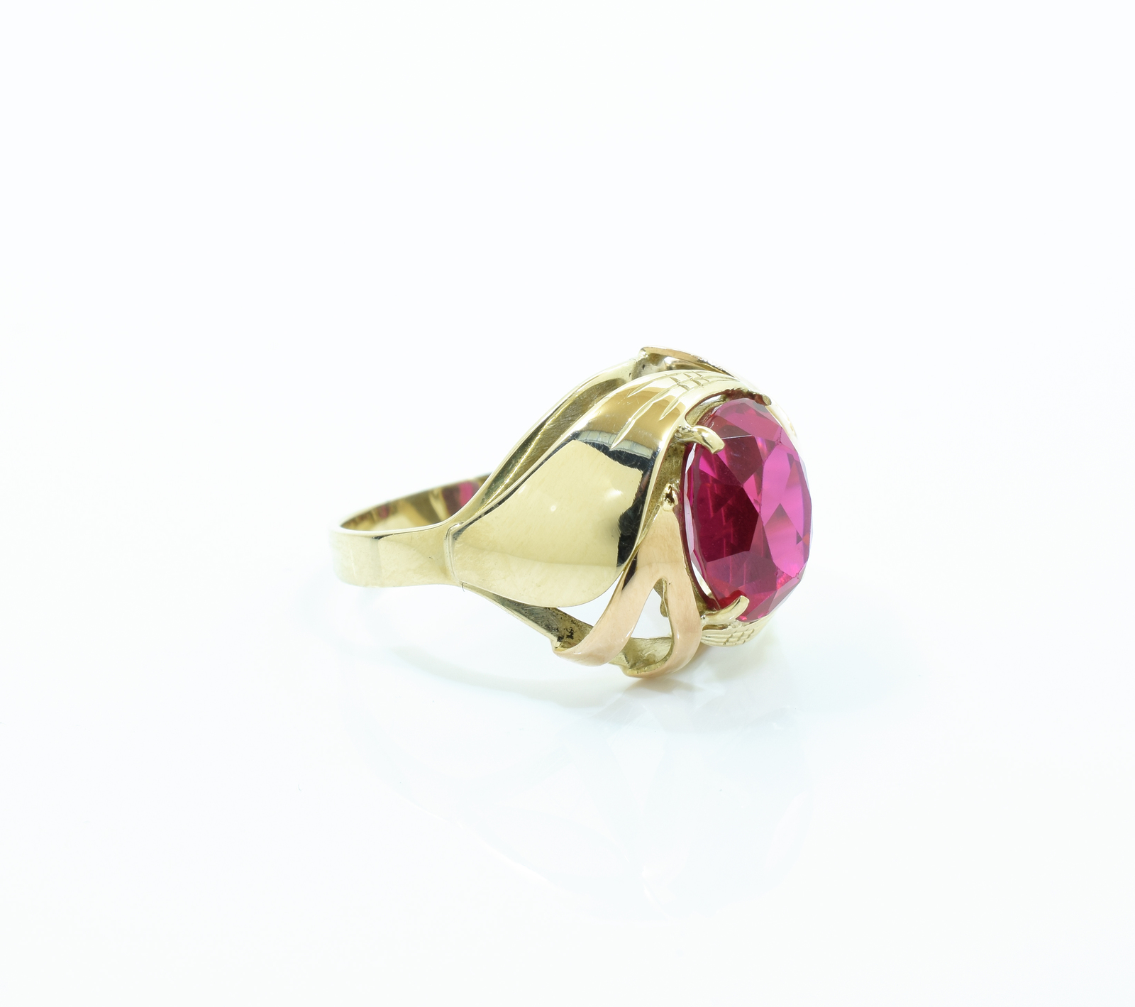 Dámský prsten v kombinaci žlutého a červeného zlata zdobený rubínem