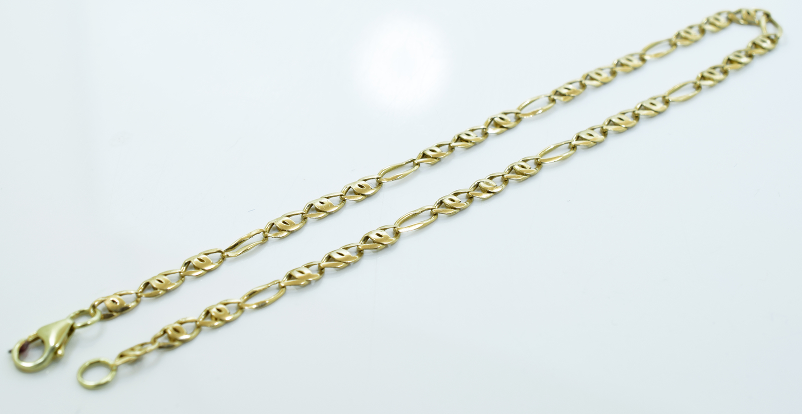 Zlatý náramek ze žlutého zlata se spojenými oválnými očky ve stylu figaro.