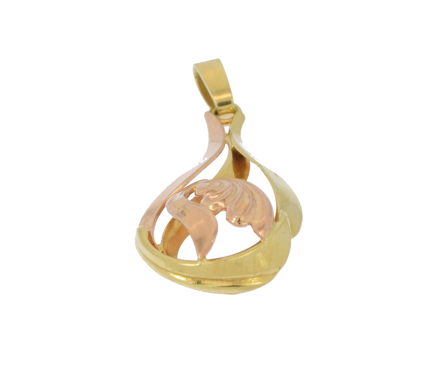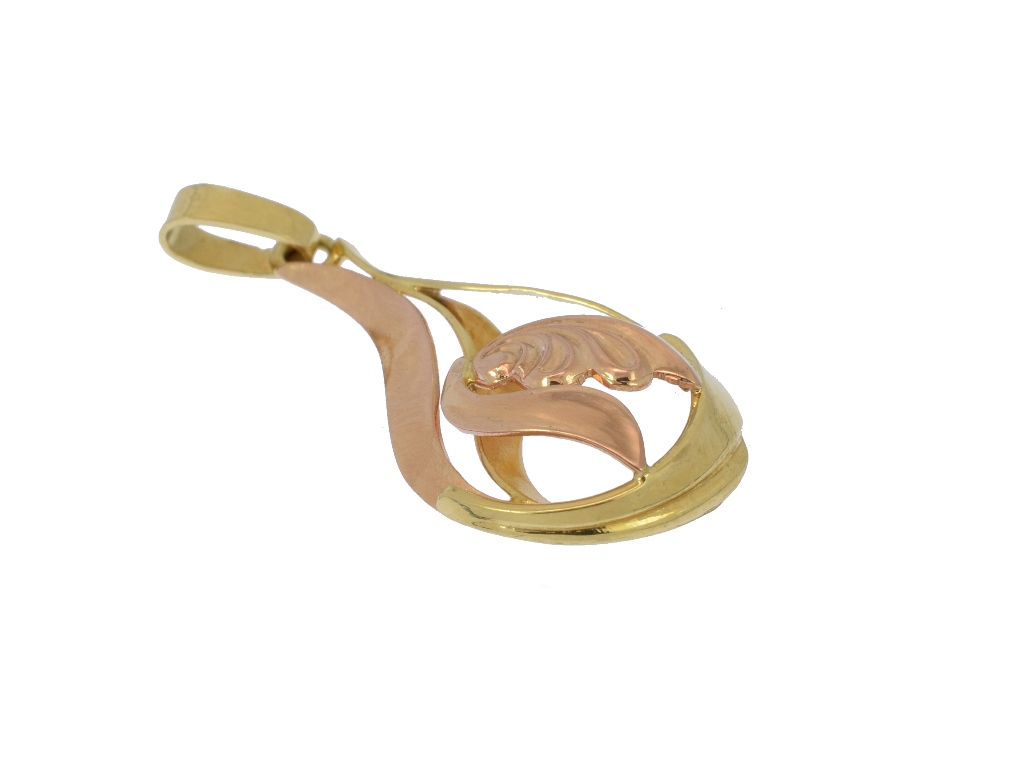 Přívěšek v kombinaci červeného a žlutého zlata ve tvaru kapky.