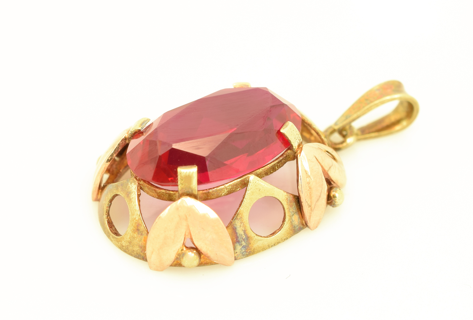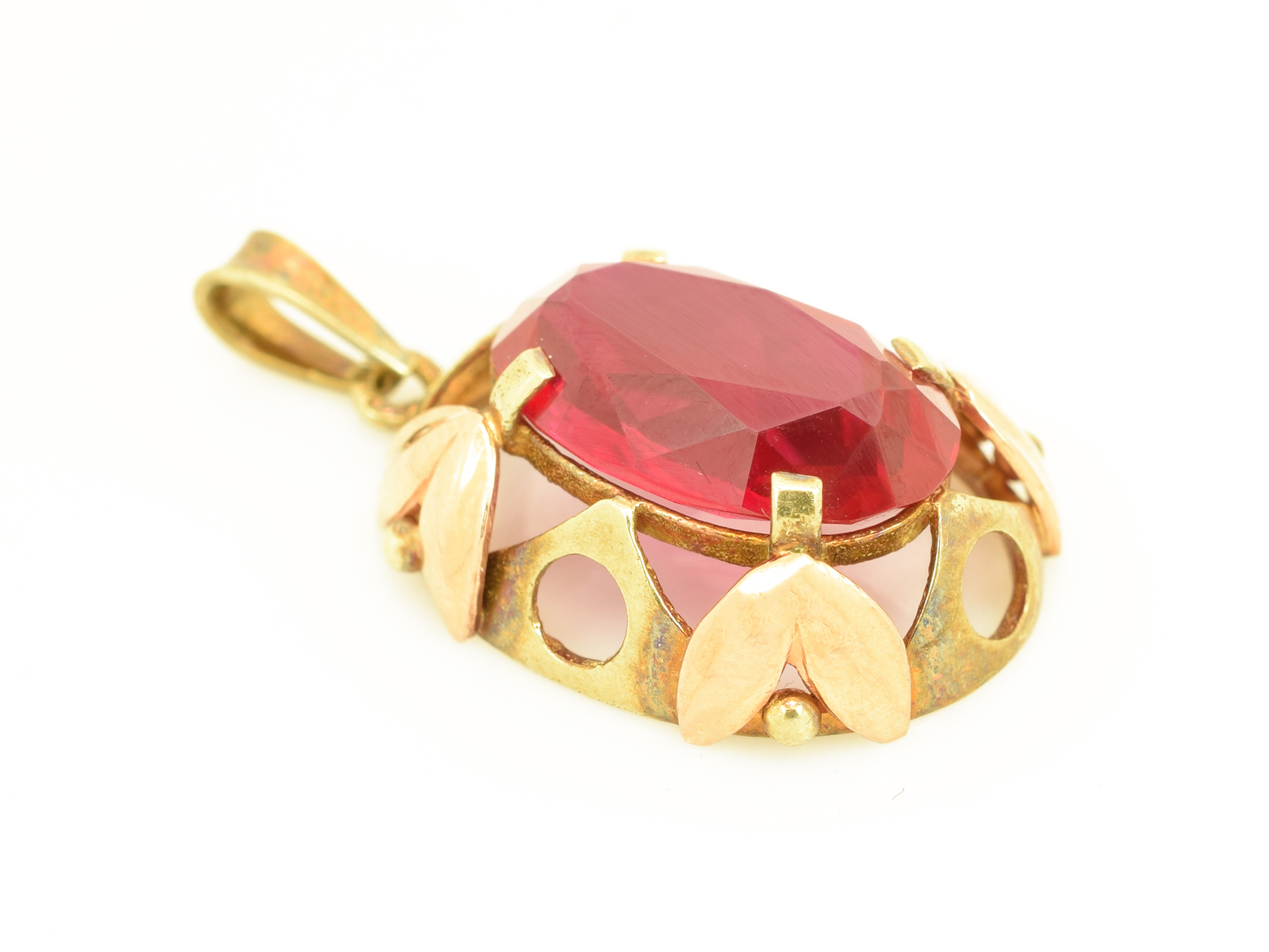 Přívěšek v kombinaci červeného a žlutého zlata zdobený červeným kamenem