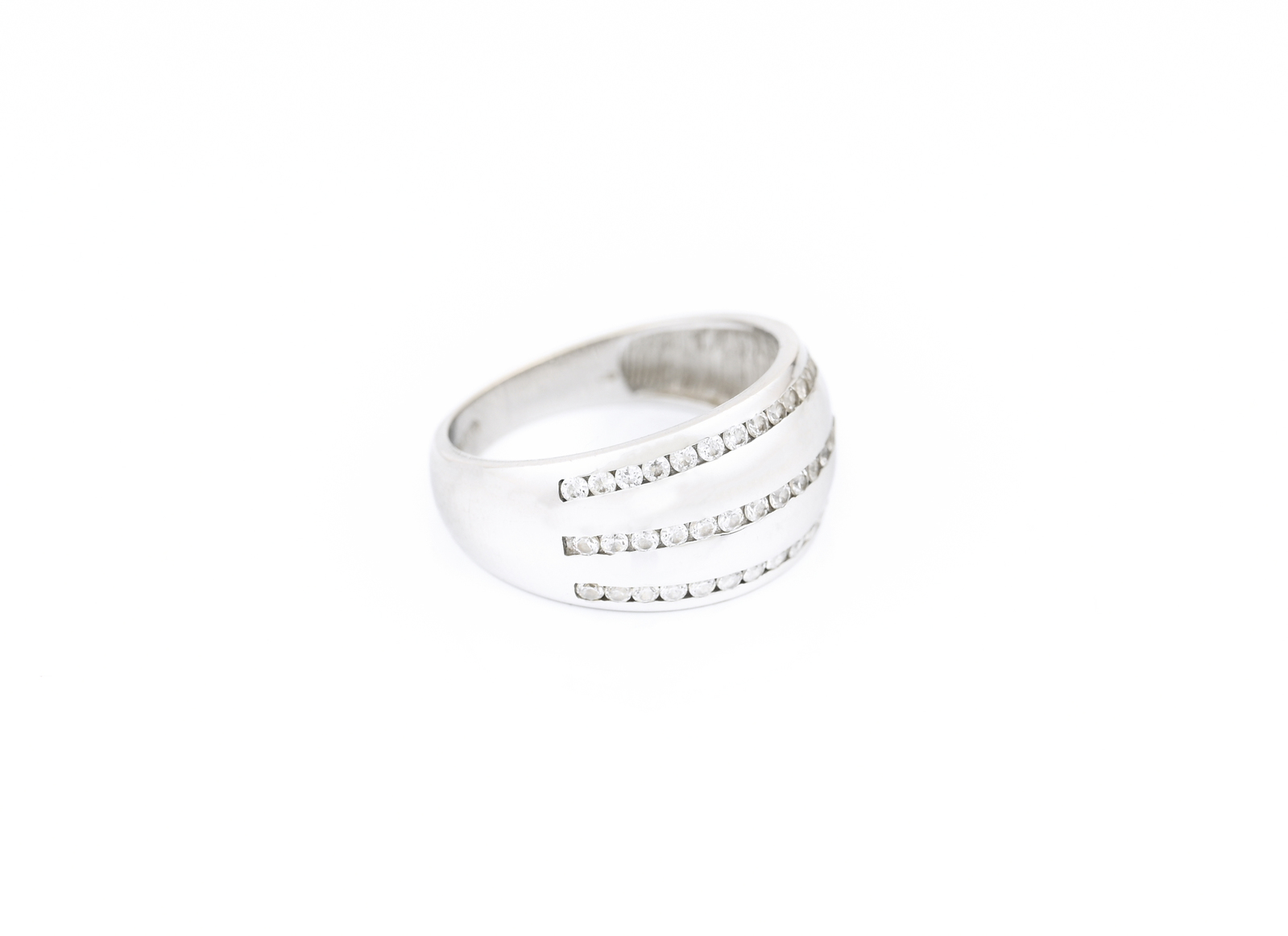 Široký prsten z bílého zlata se třemi řadami třpytivých zirkonů.