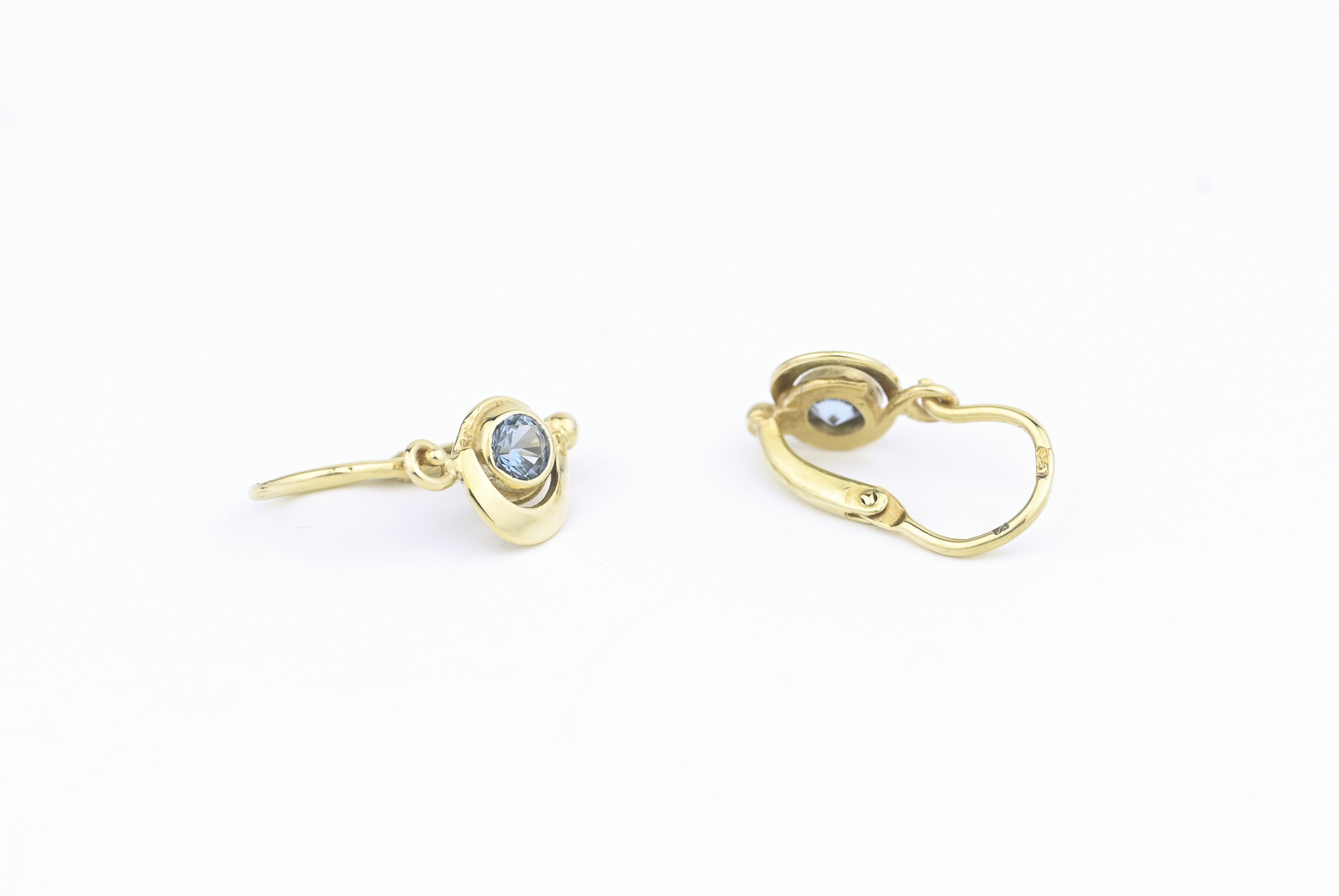 Zlaté dětské náušnice, zdobené akvamarínem.
