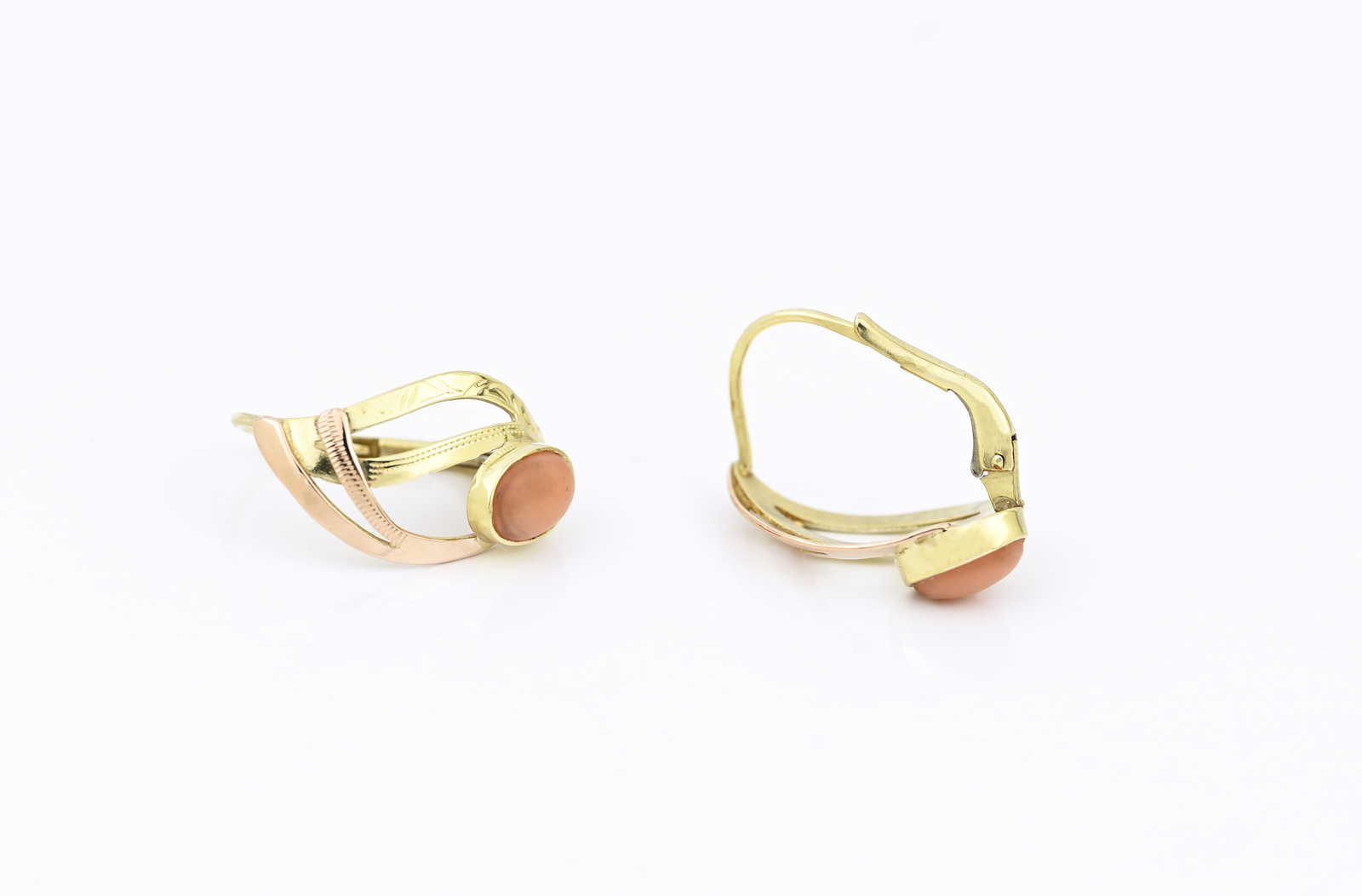 Zlaté náušnice, s červeným zlatem, zdobené korálem.