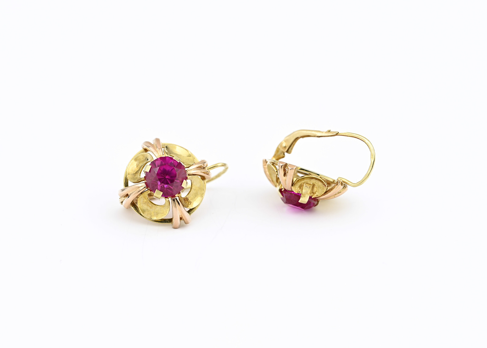 Zlaté náušnice, s červeným zlatem zdobené rubíny.