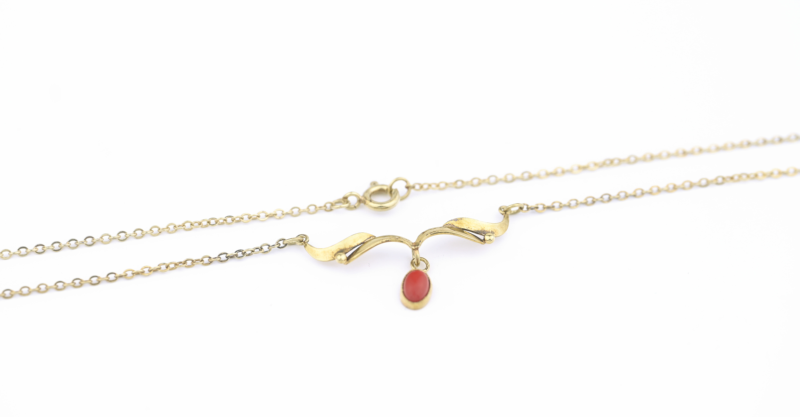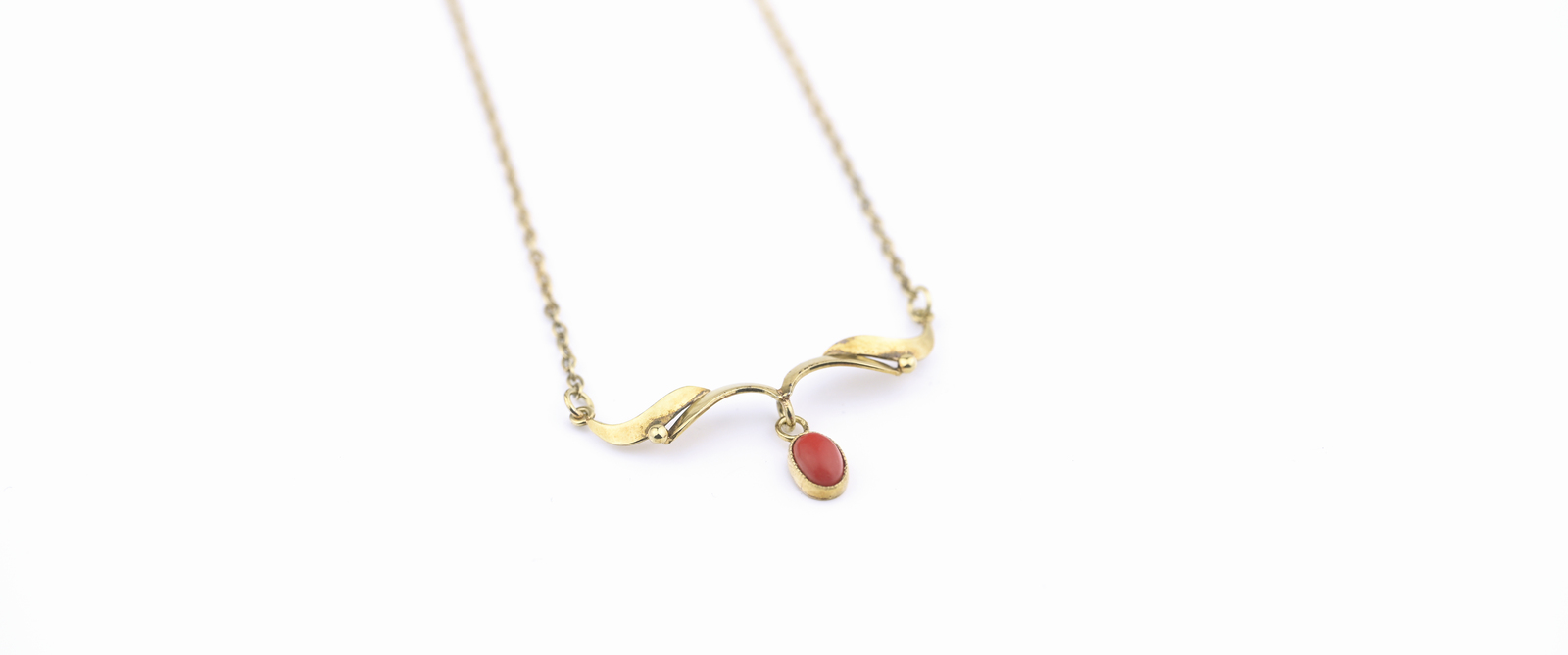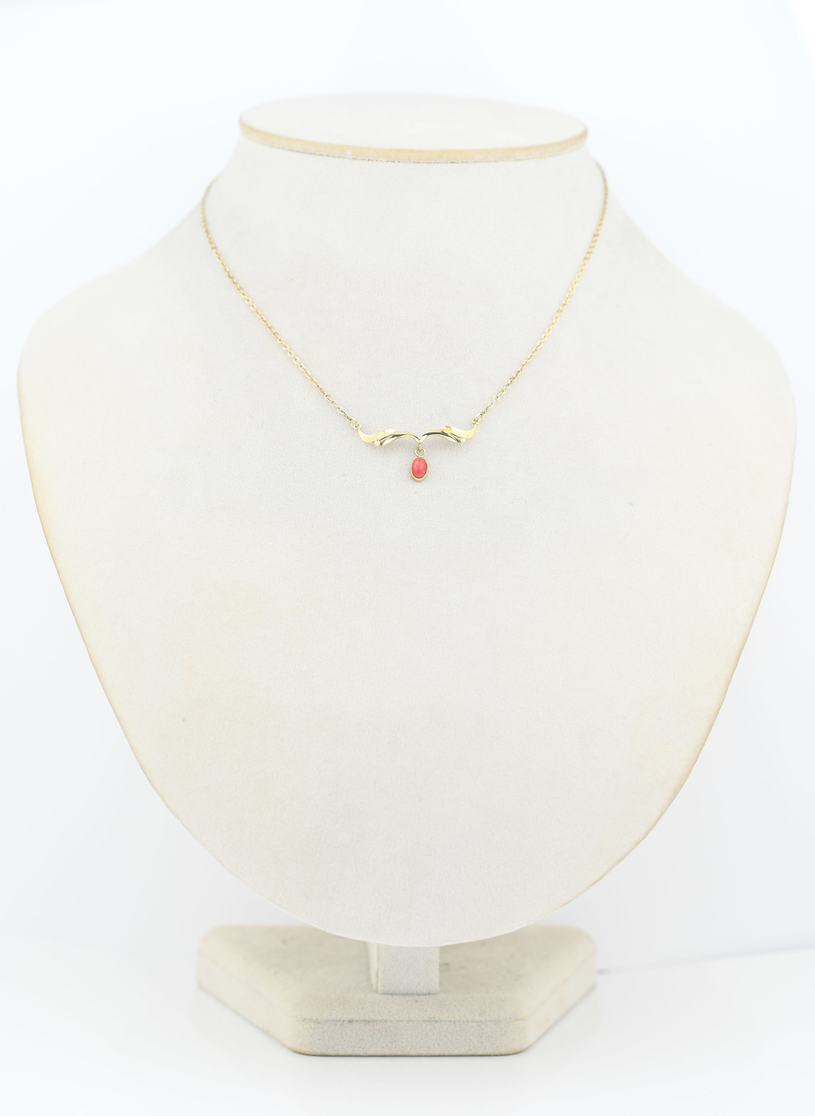 Zlatý náhrdelník zdobený korálem.
