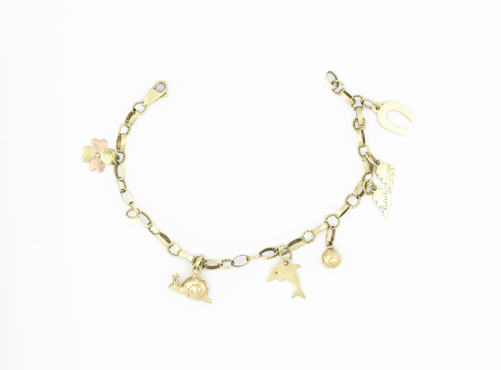 Zlatý náramek, zdobený přívěšky, žebráček.