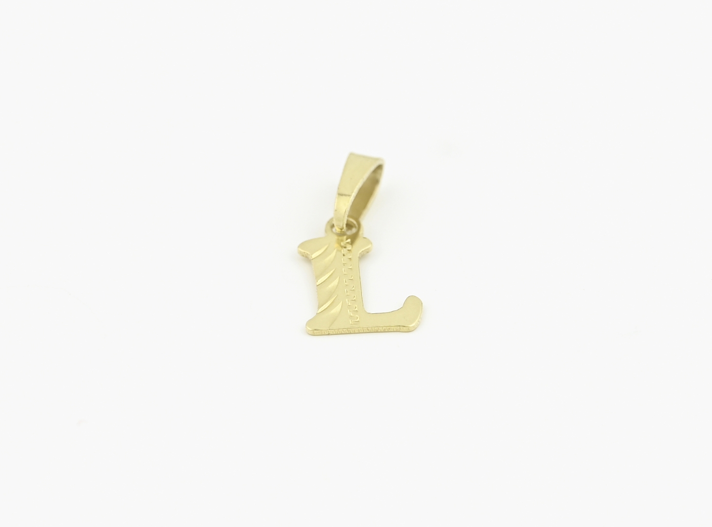 Zlatý přívěšek ve tvaru písmene L ze žlutého zlata s jemným reliéfem na povrchu.