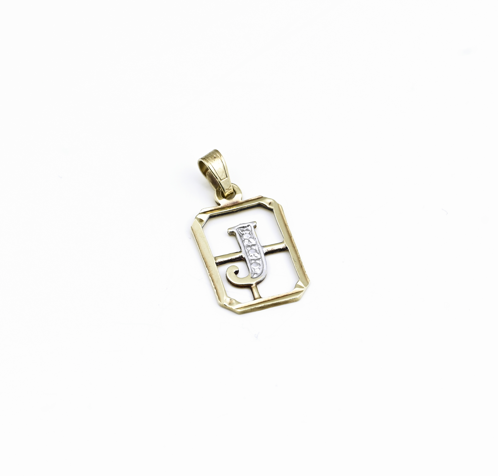 Zlatý přívěšek, s písmenem J v bílém zlatě.