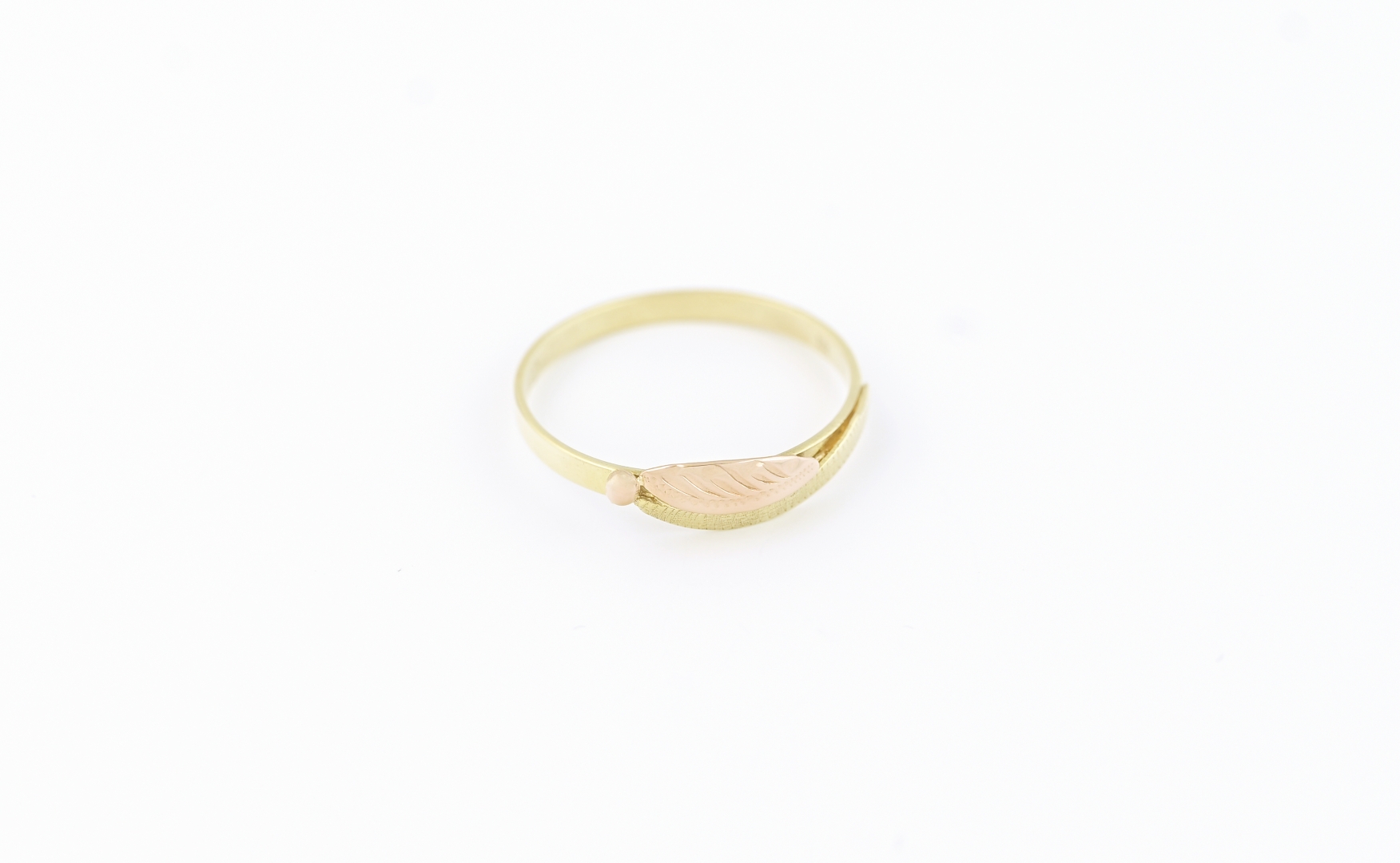 Zlatý prsten s jemným listem ze červeného zlata na lesklé žluté obroučce.