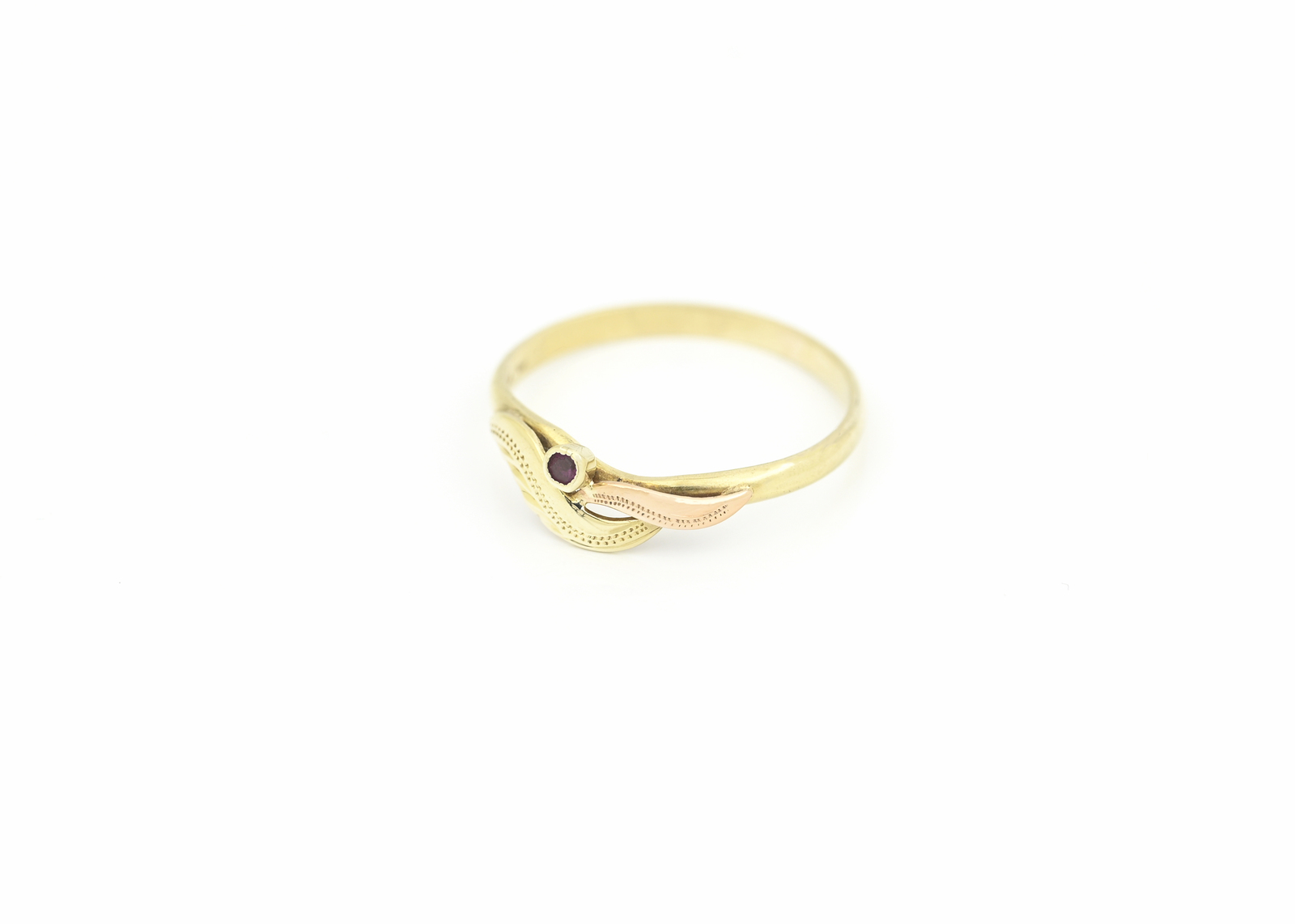 Zlatý prsten, kombinace s červeným zlatem, zdobený rubínem.
