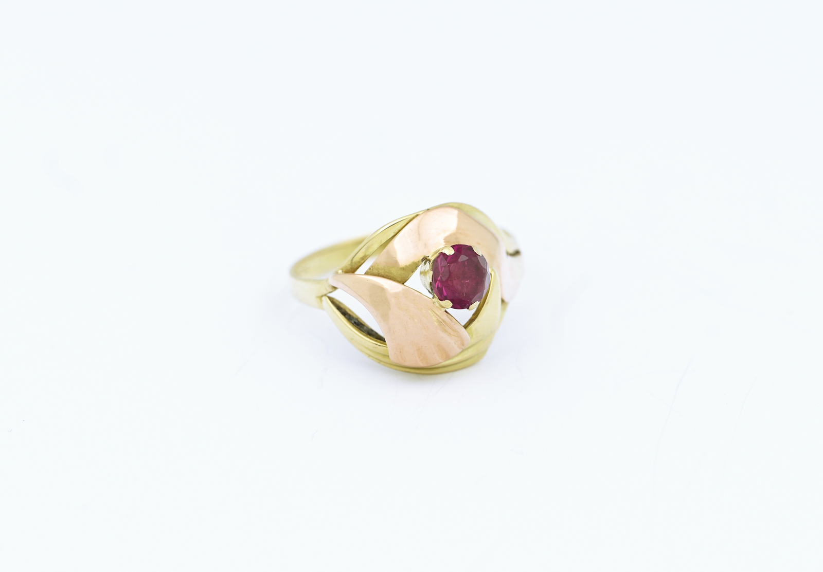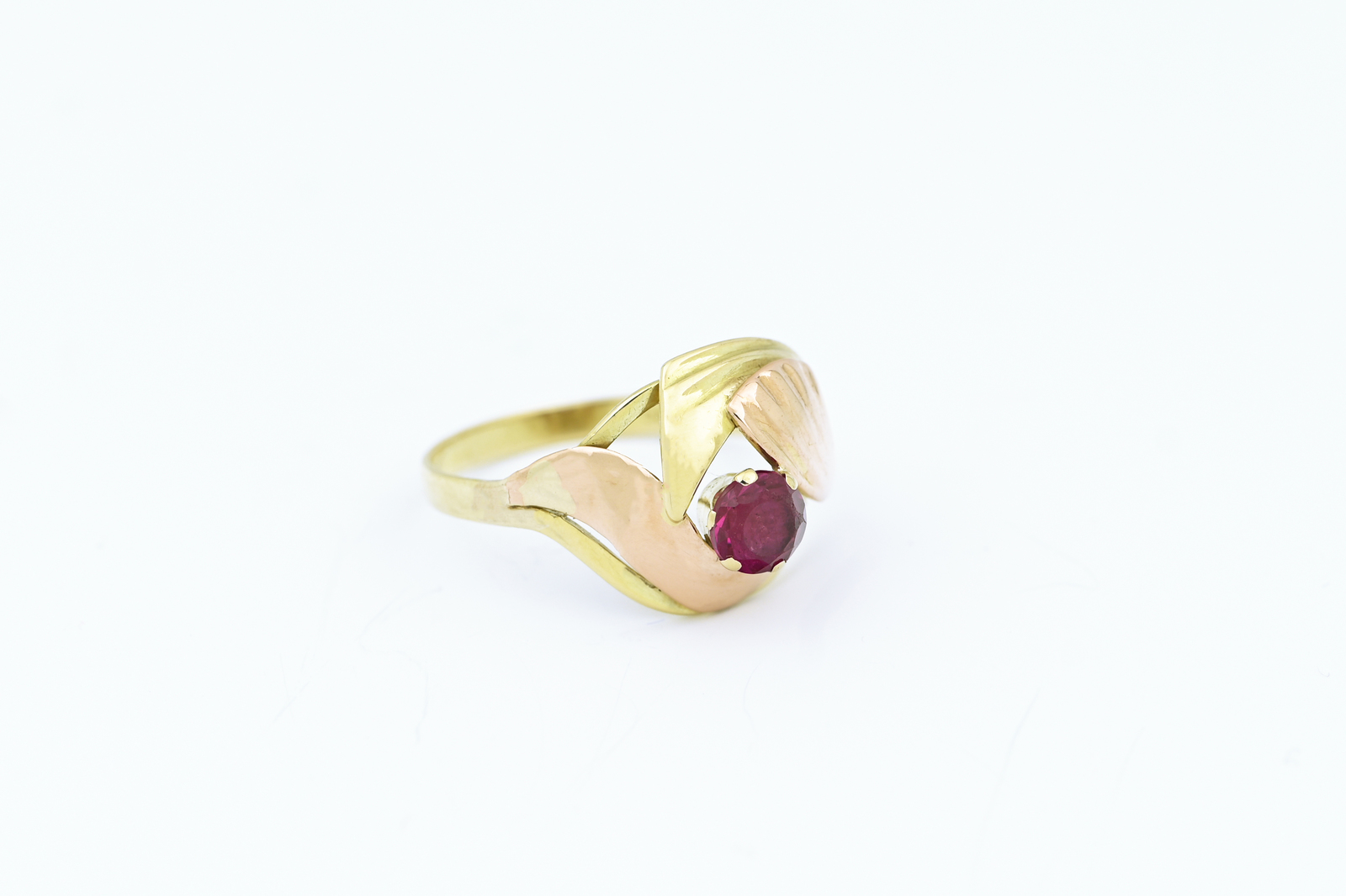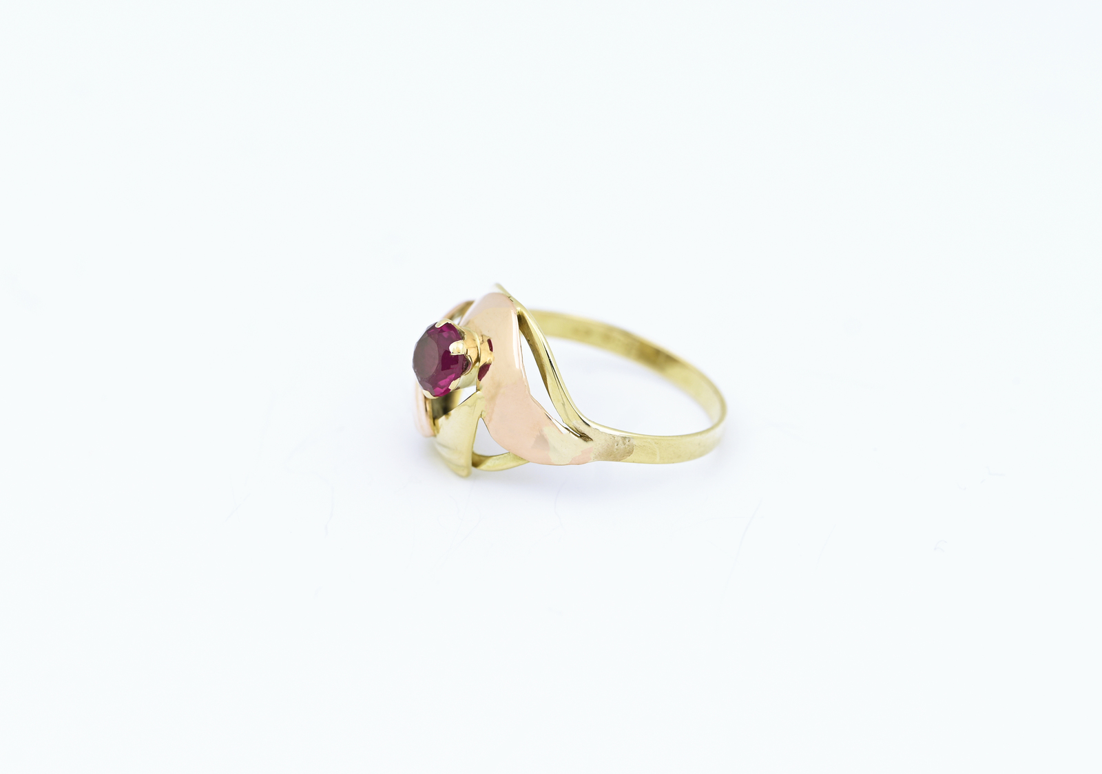 Zlatý prsten, kombinované zlato, zdobený rubínem.