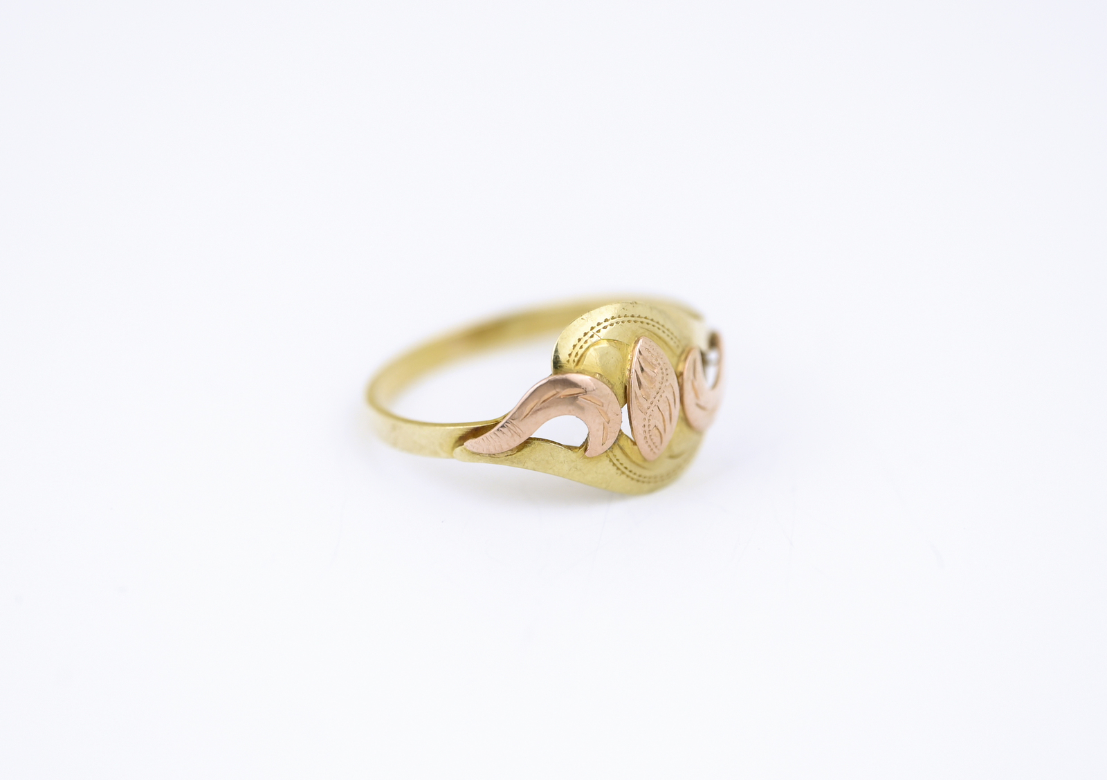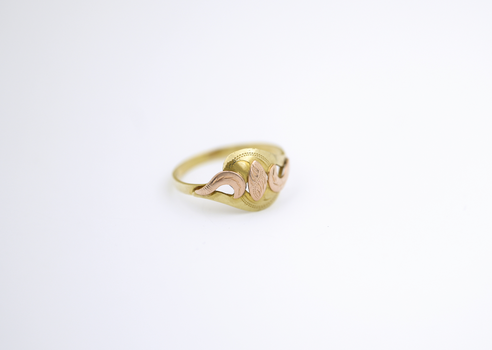 Zlatý prsten, kombinovaný s červeným zlatem, zdobený.
