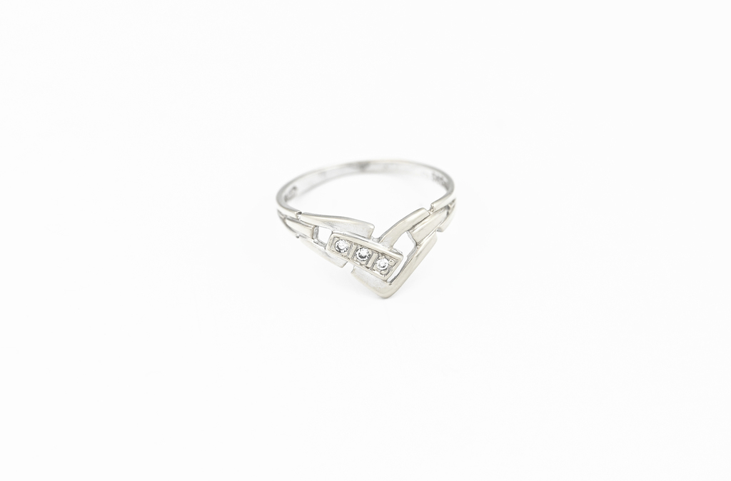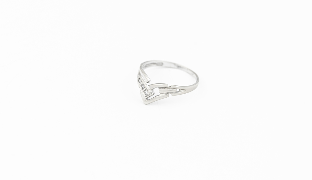 Bílý zlatý prsten ve tvaru špičky se třemi zasazenými diamanty.
