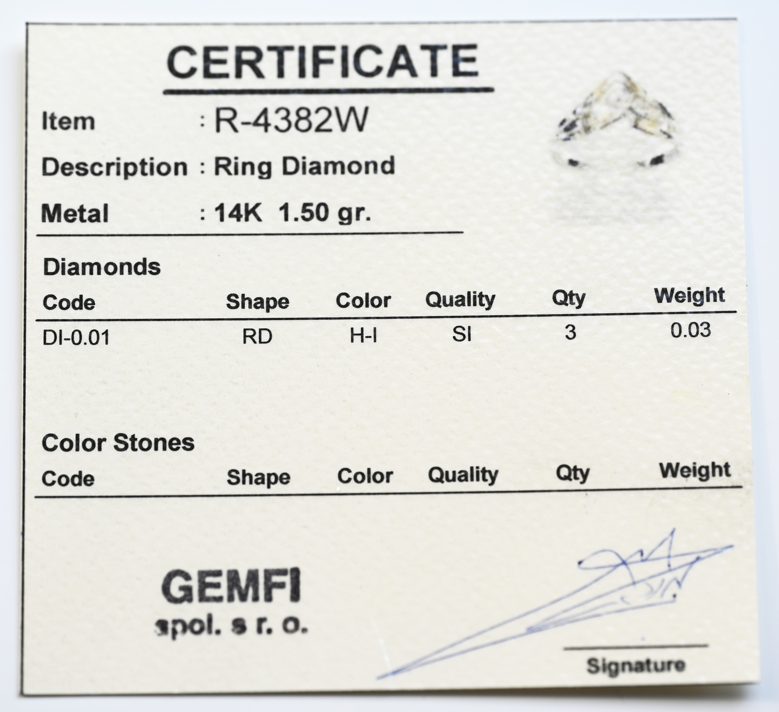 Obroučka se směrem k vrcholu rozevírá do tvarovaného výřezu, kde jsou tři malé diamanty zasazeny vedle sebe v řadě.
