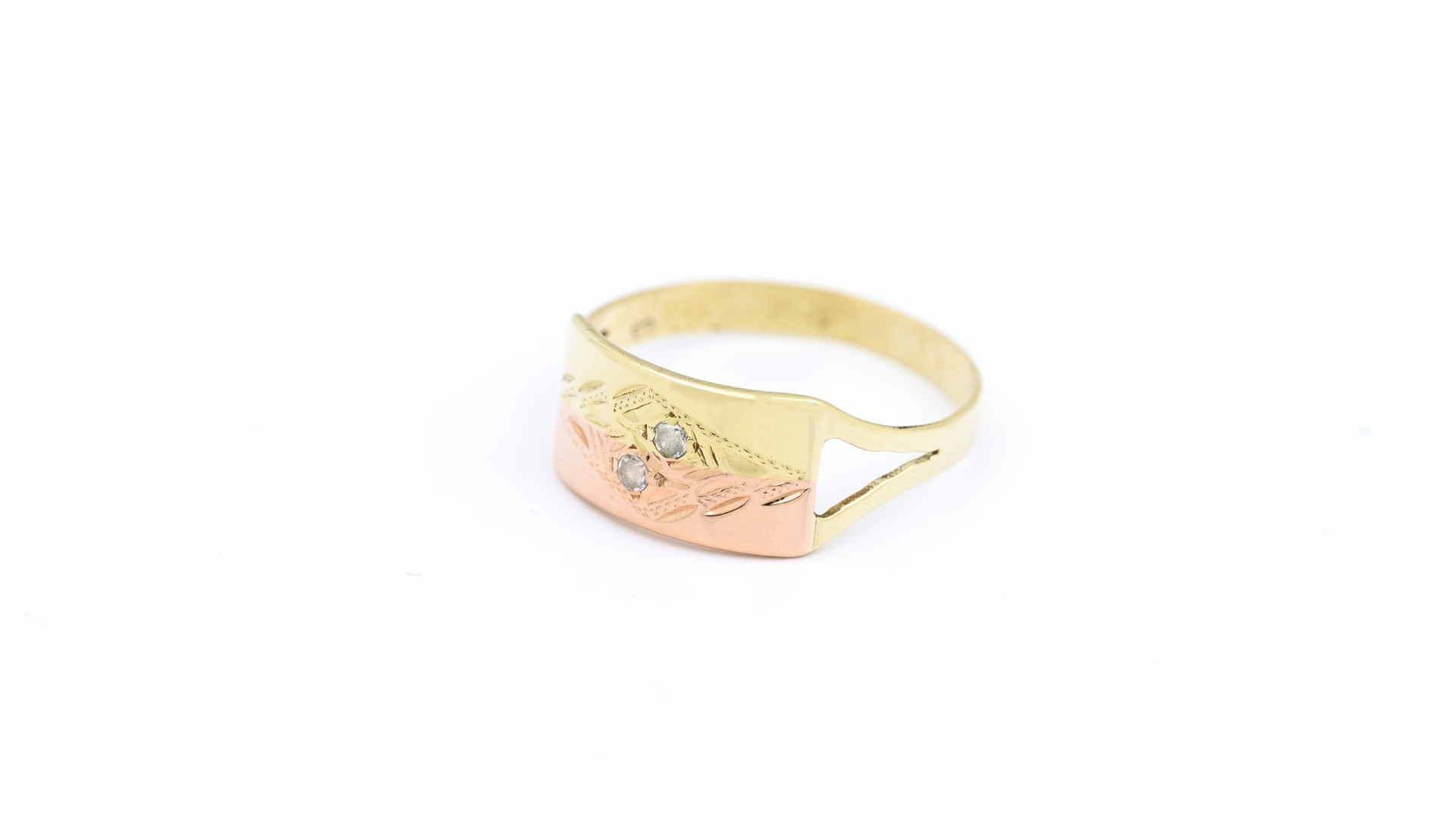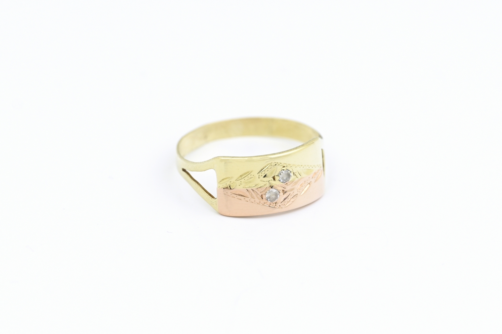 Zlatý prsten, s červeným zlatem, zdobený zirkony.