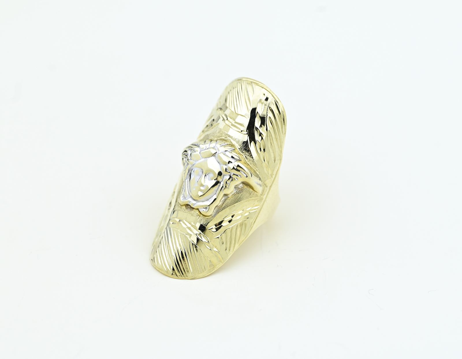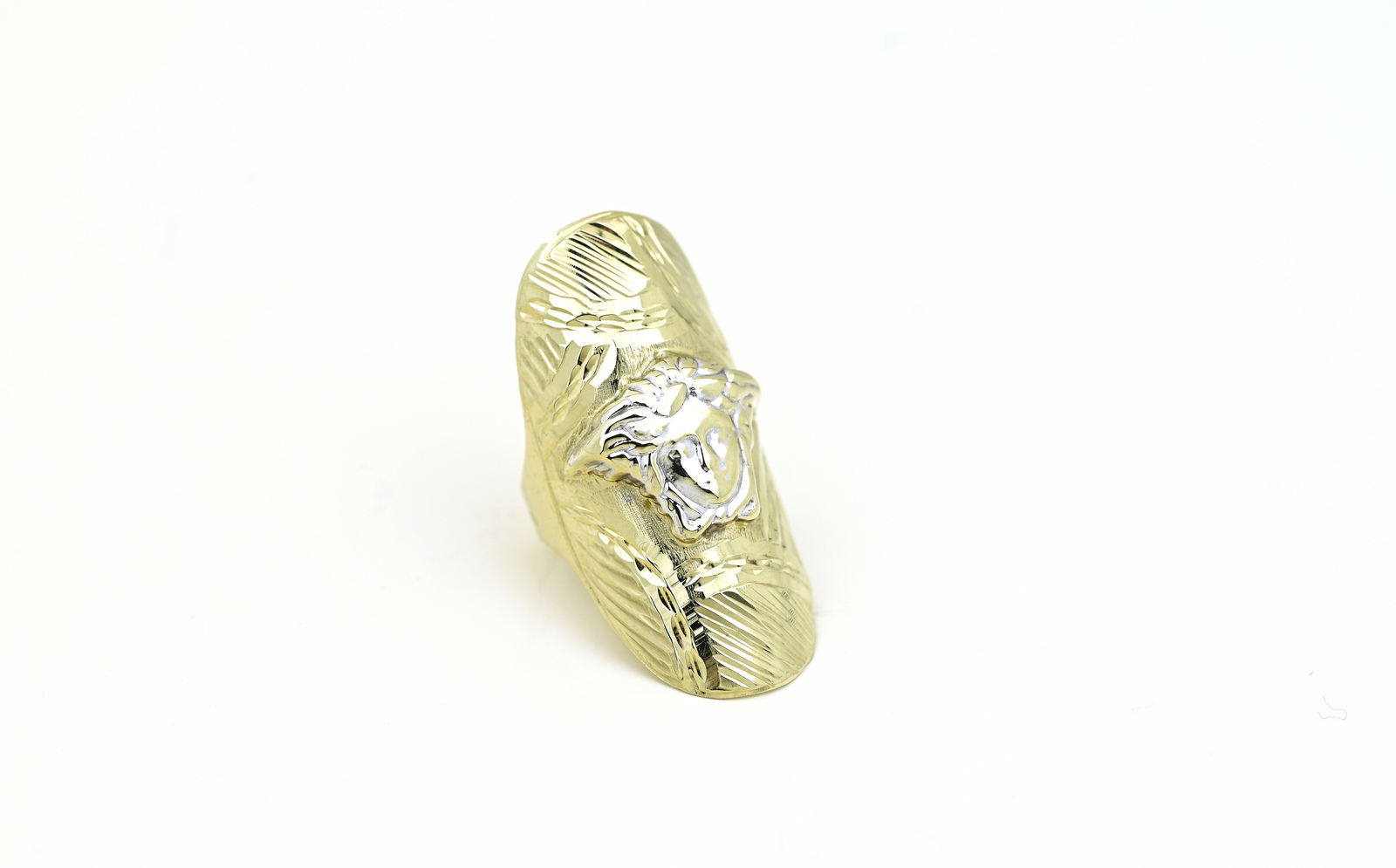 Zlatý prsten, větší zdobená ploška, s bílým zlatem.