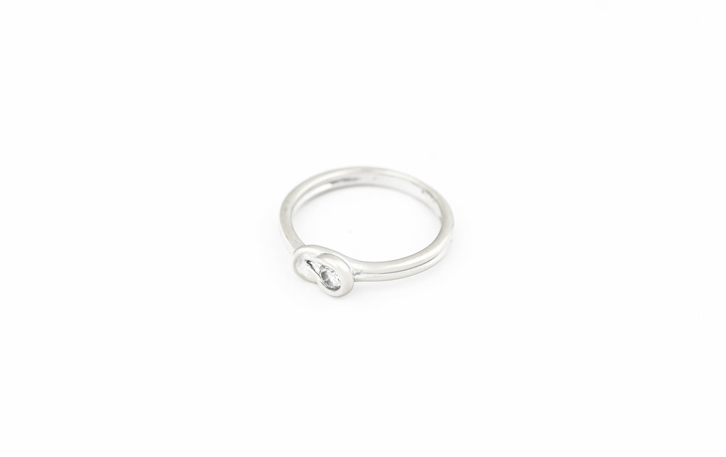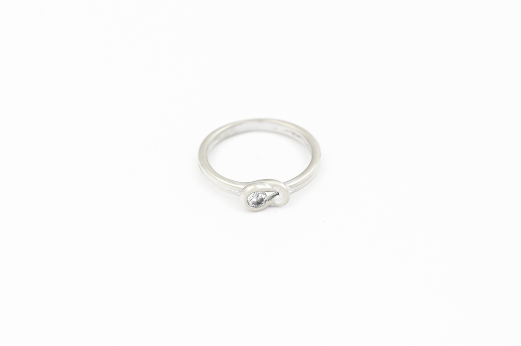 Jemný prsten z bílého zlata s uzel motivem a zasazeným diamantem.
