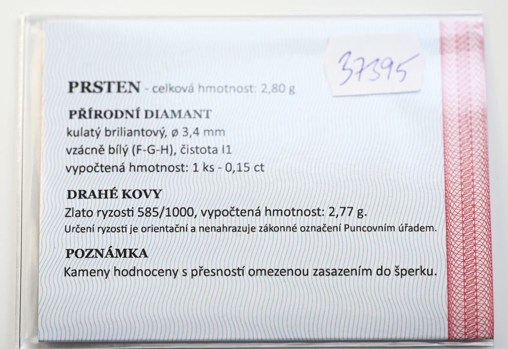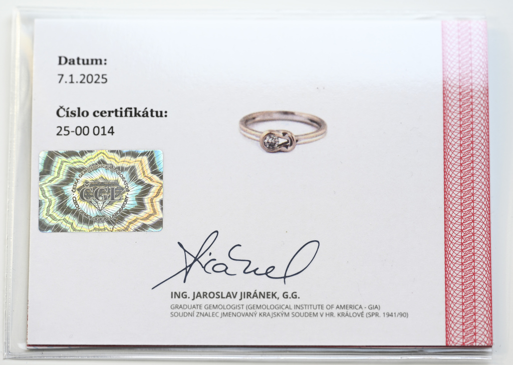 Obroučka je tvarovaná do uzlu, ve kterém je pevně zasazený kulatý diamant o průměru 3,4 mm.
