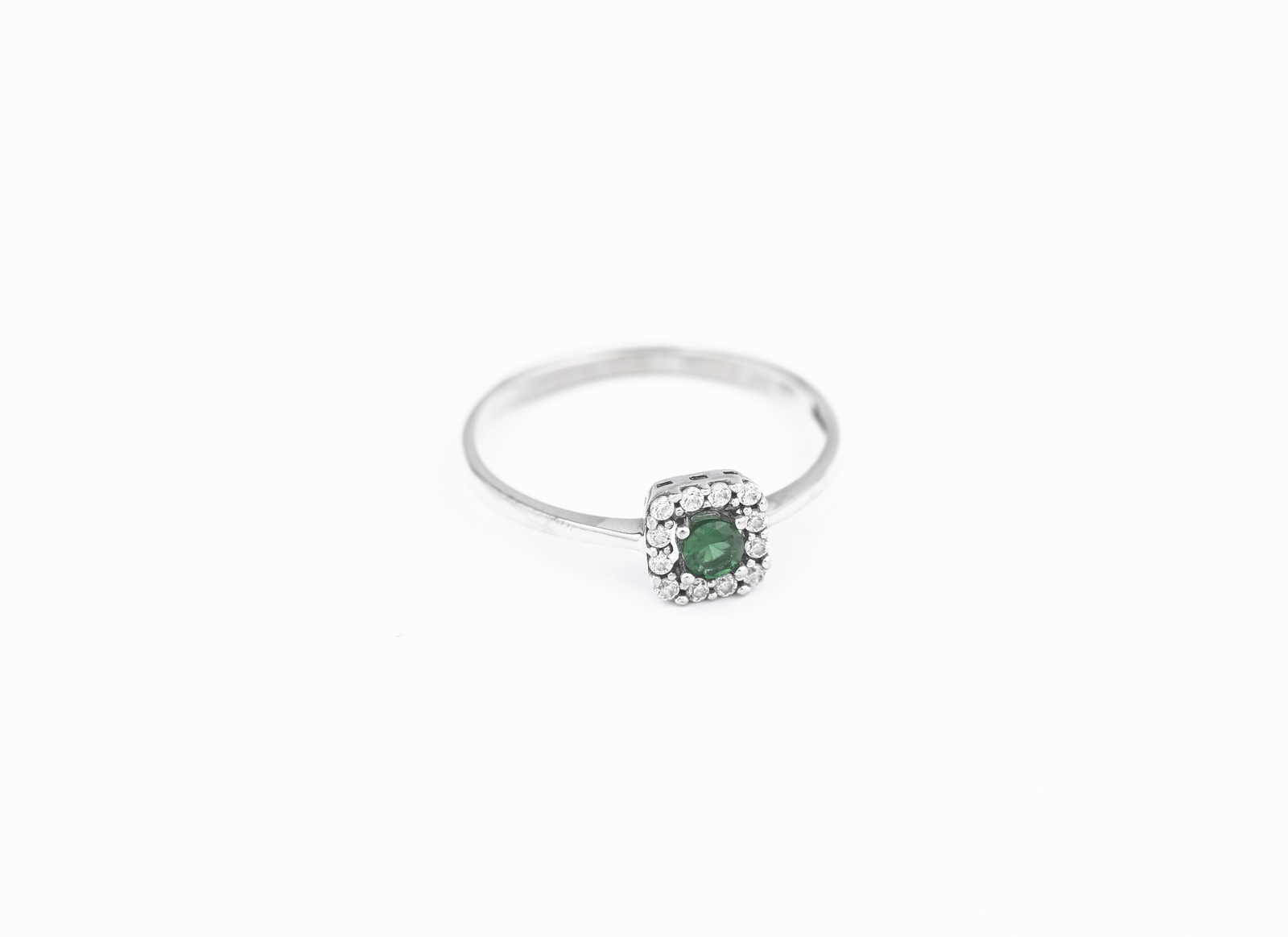 Zlatý prsten, z bílého zlata zdoberný smaragdem a zirkony.