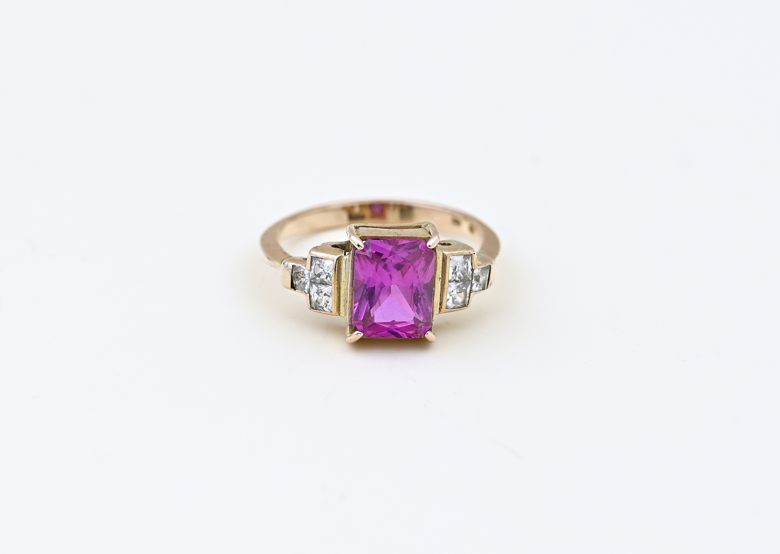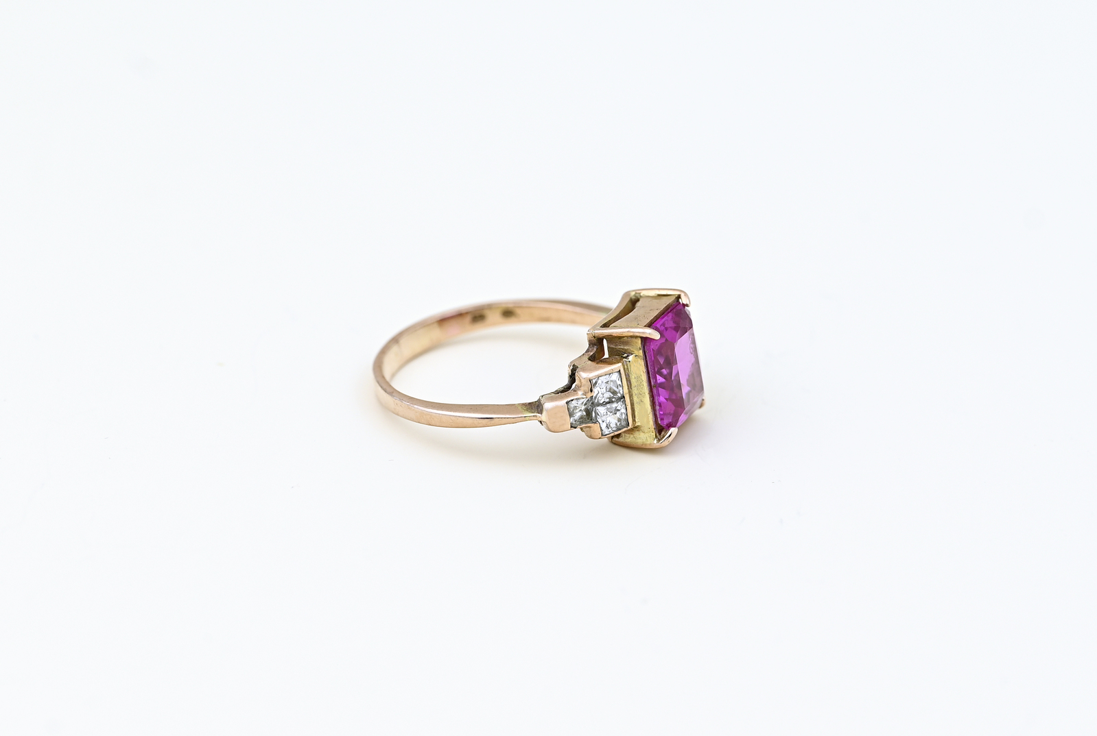 Zlatý prsten, z červeného zlata, zdobený rubínem a zirkony.