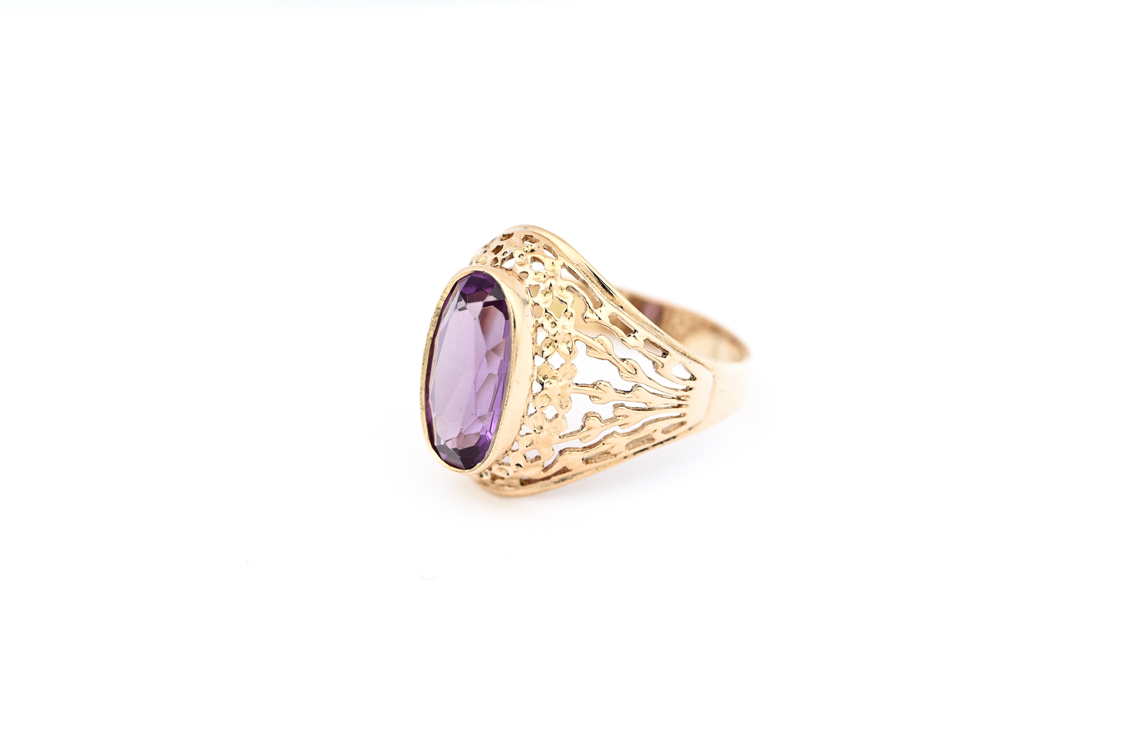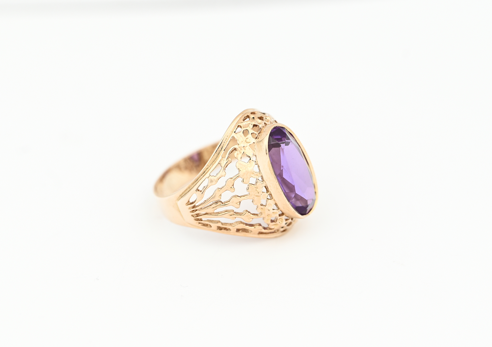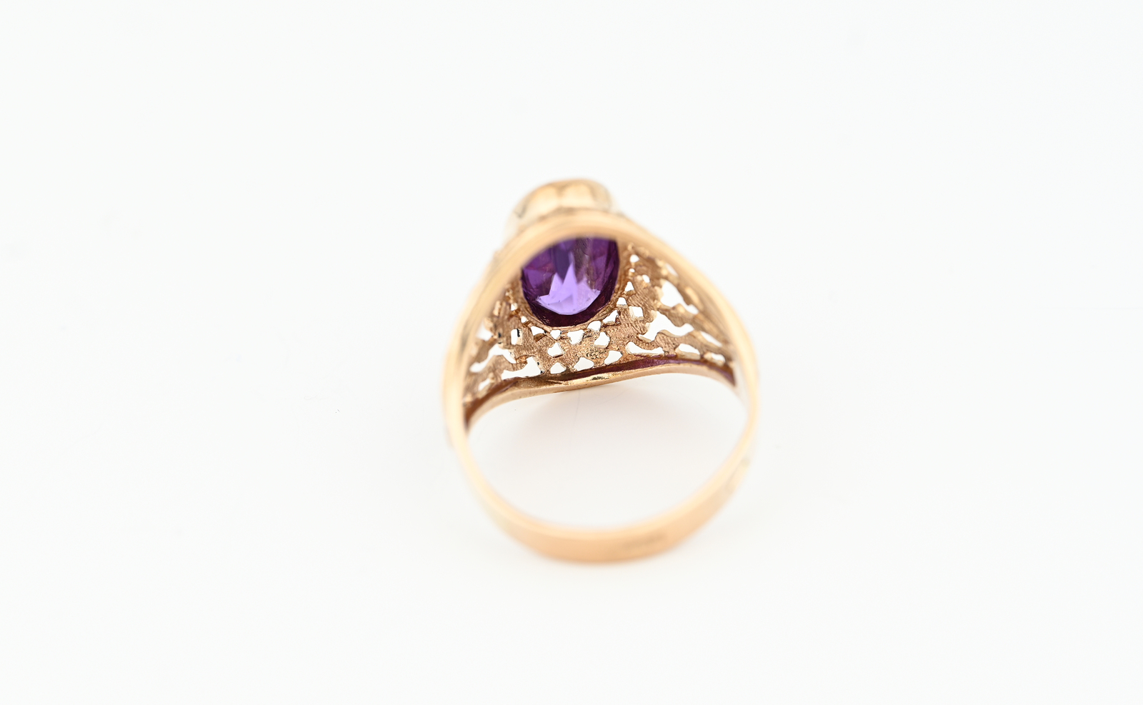 Zlatý prsten, z růžové zlata, zdobený ametystem.