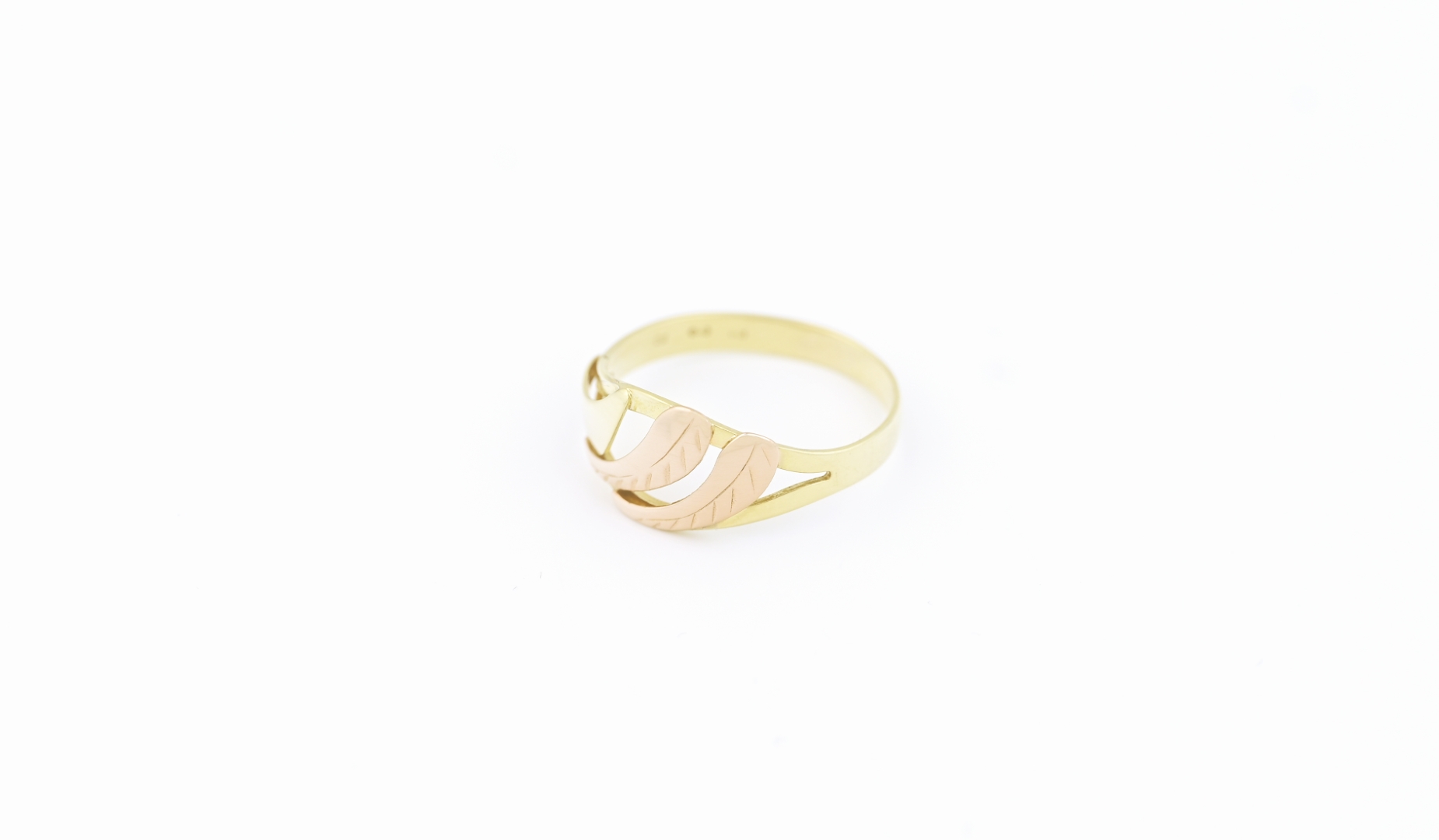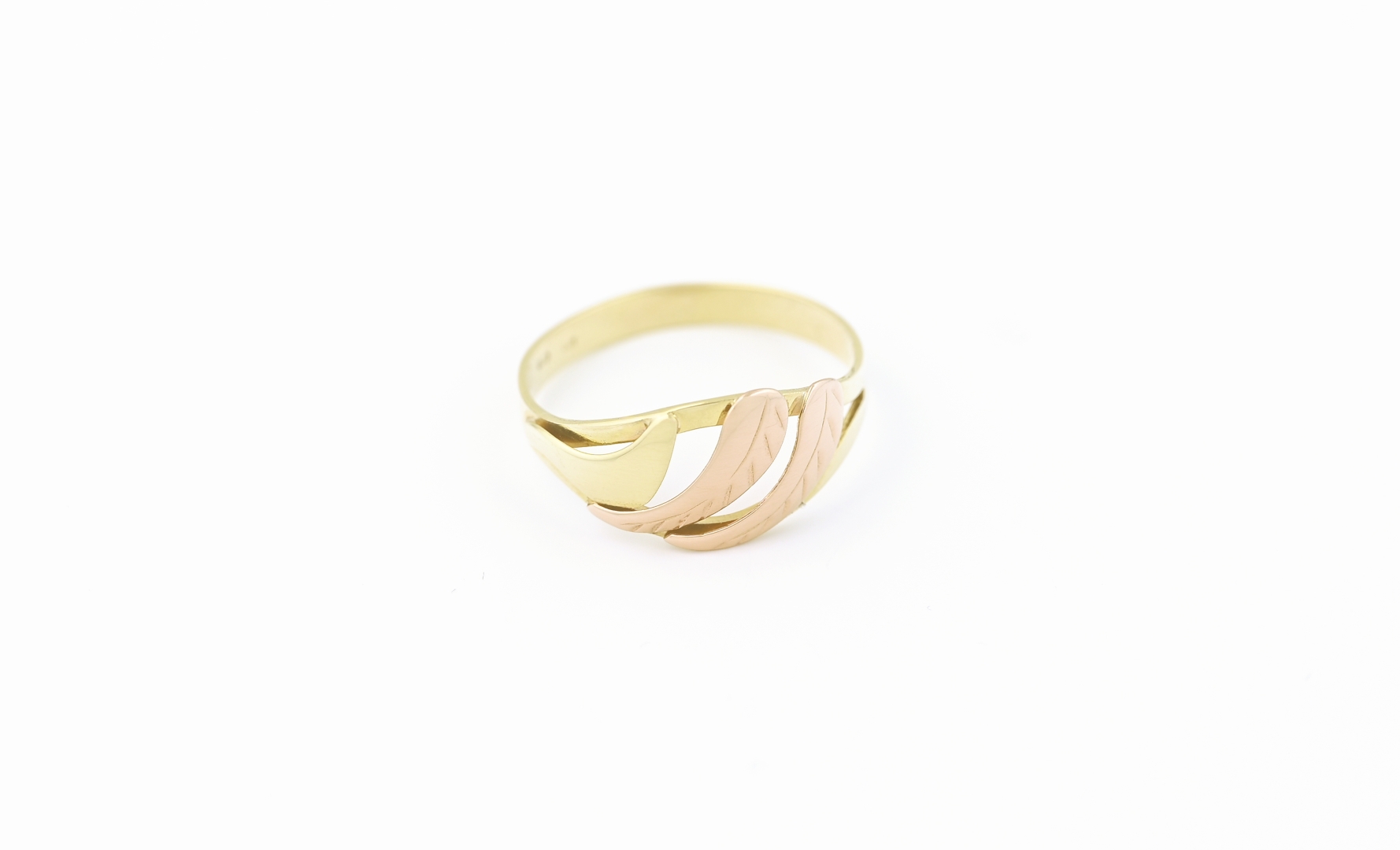 Zlatý prsten, zdobené plátky s červeným zlatem. 1,62g