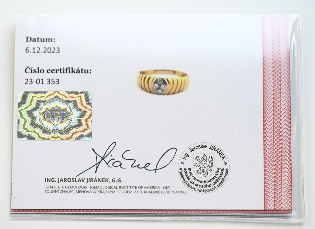 Zlatý prsten, zdobený čtyřmi diamanty 0,13ct. 3,62g