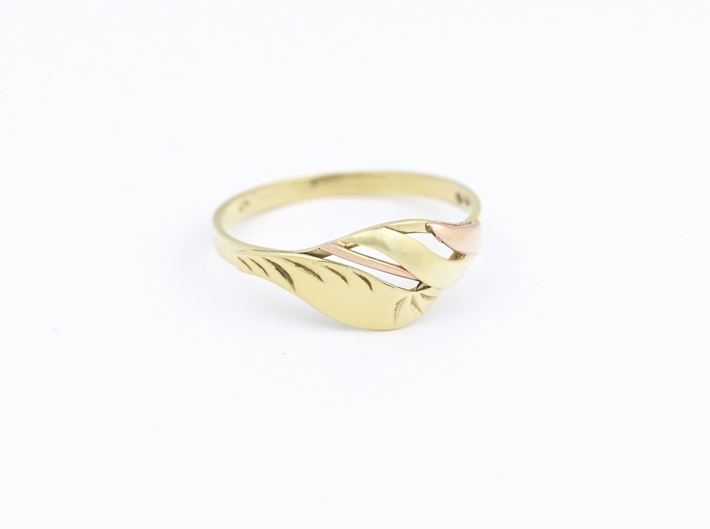 Zlatý prsten, zdobený vzorem, s červeným zlatem.