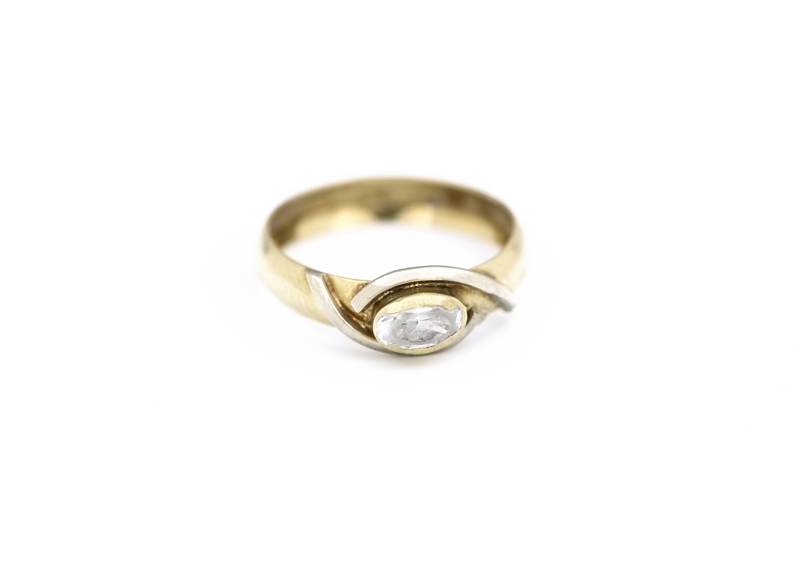 Zlatý prsten, zdobený zirkonem, s bílým zlatem.