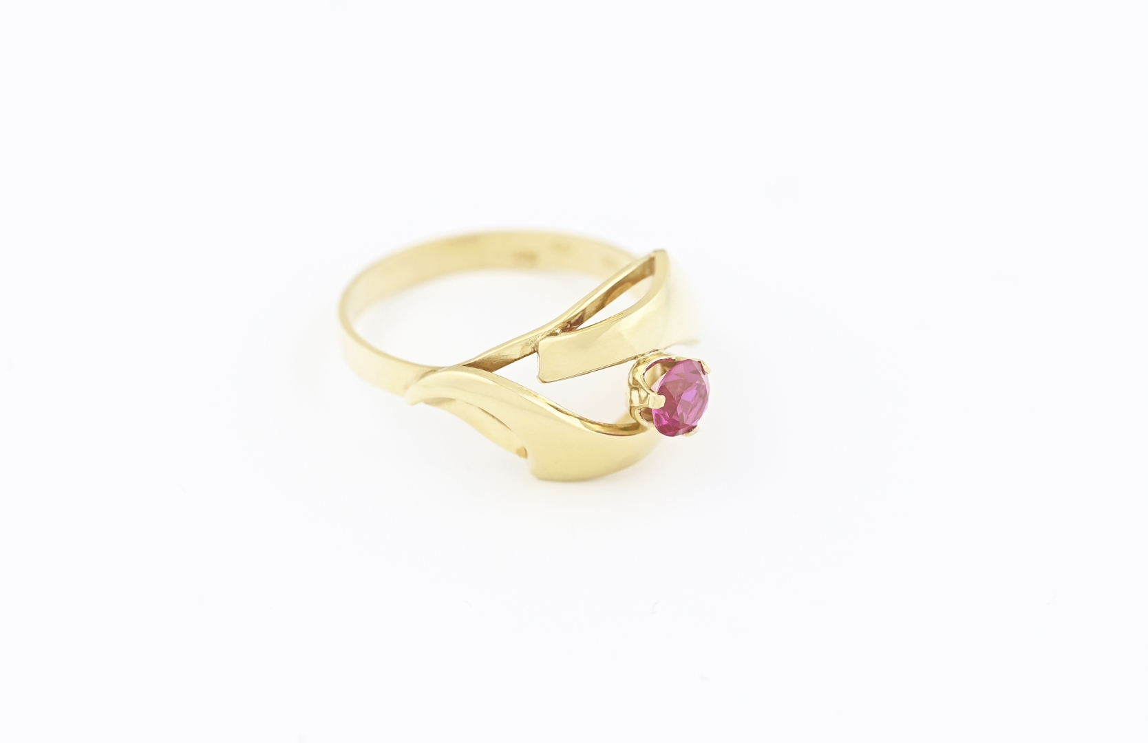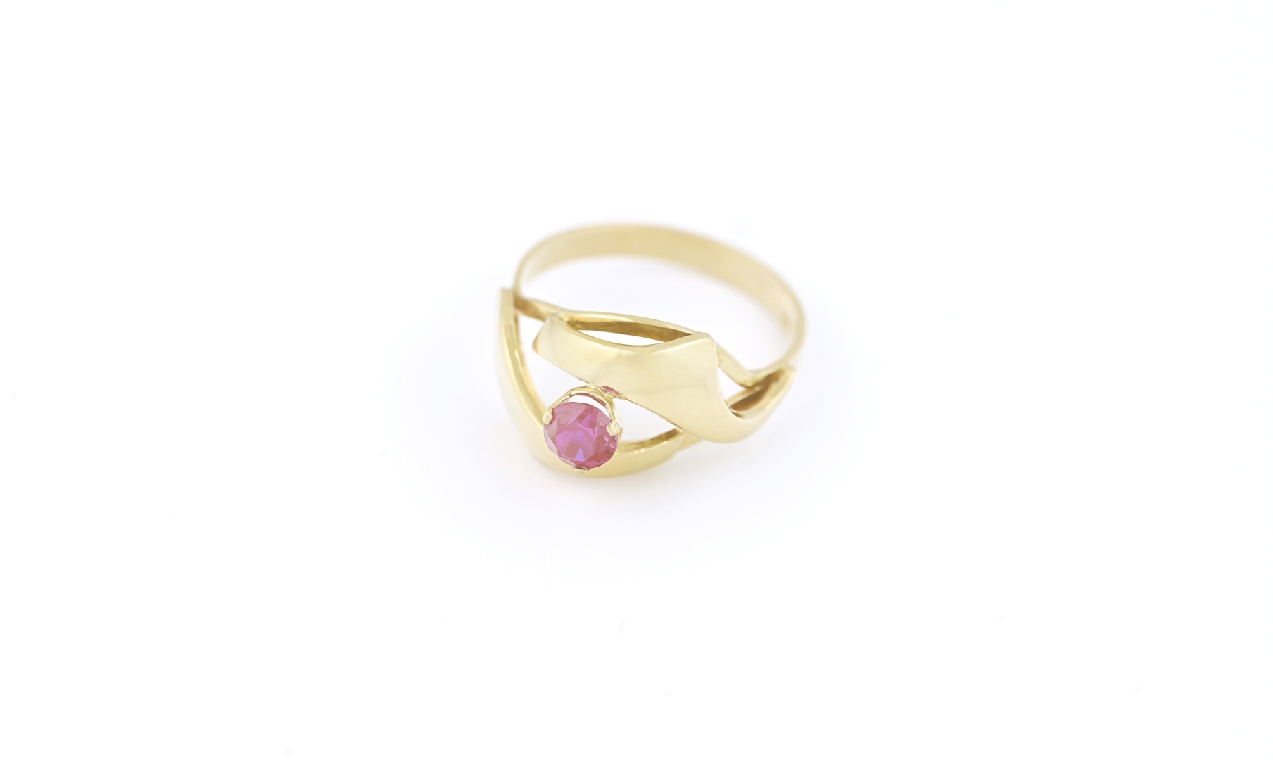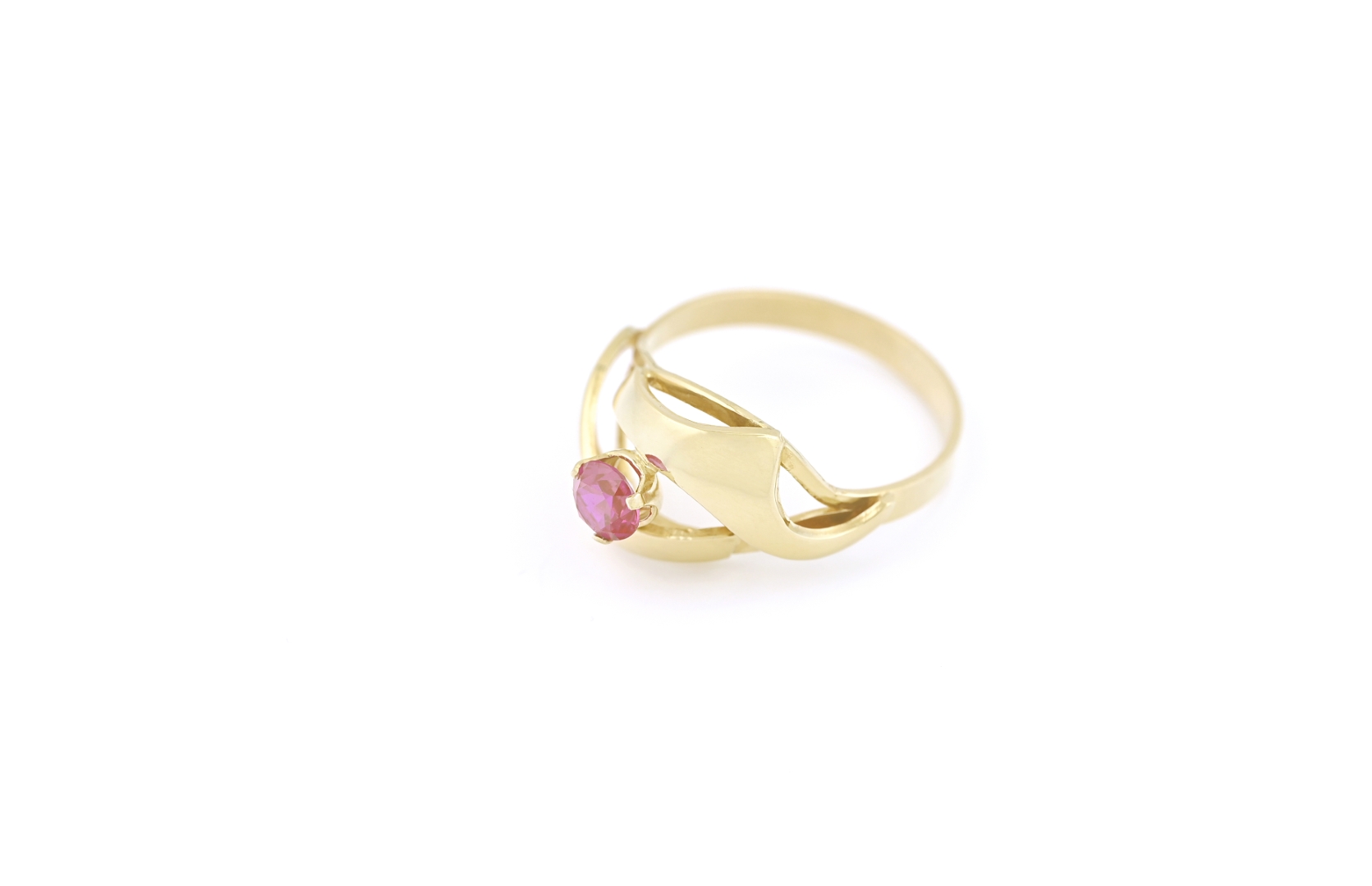 Zlatý prsten ve žlutém zlatě s červeným kamenem zasazeným mezi zvlněnými plátky.