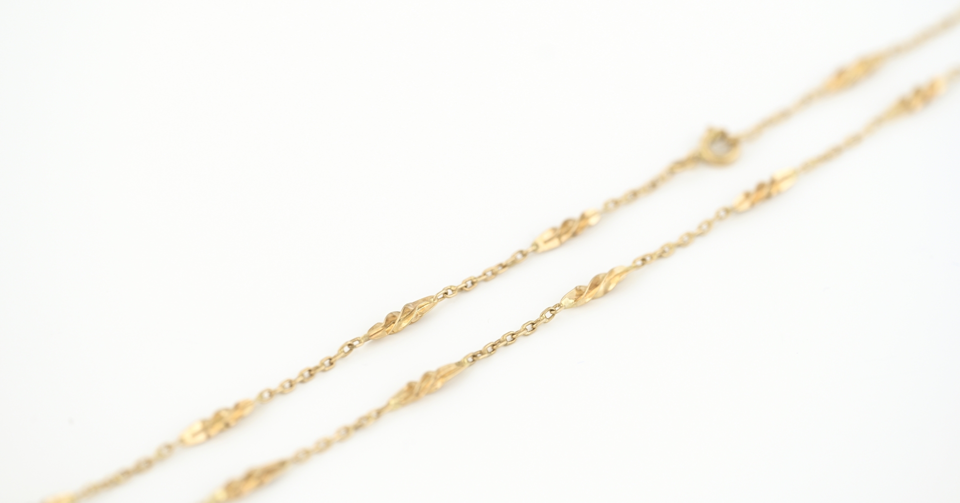 Zlatý řetízek ve žlutém zlatě se střídajícími se drobnými oválnými články a jednoduchými očky.
