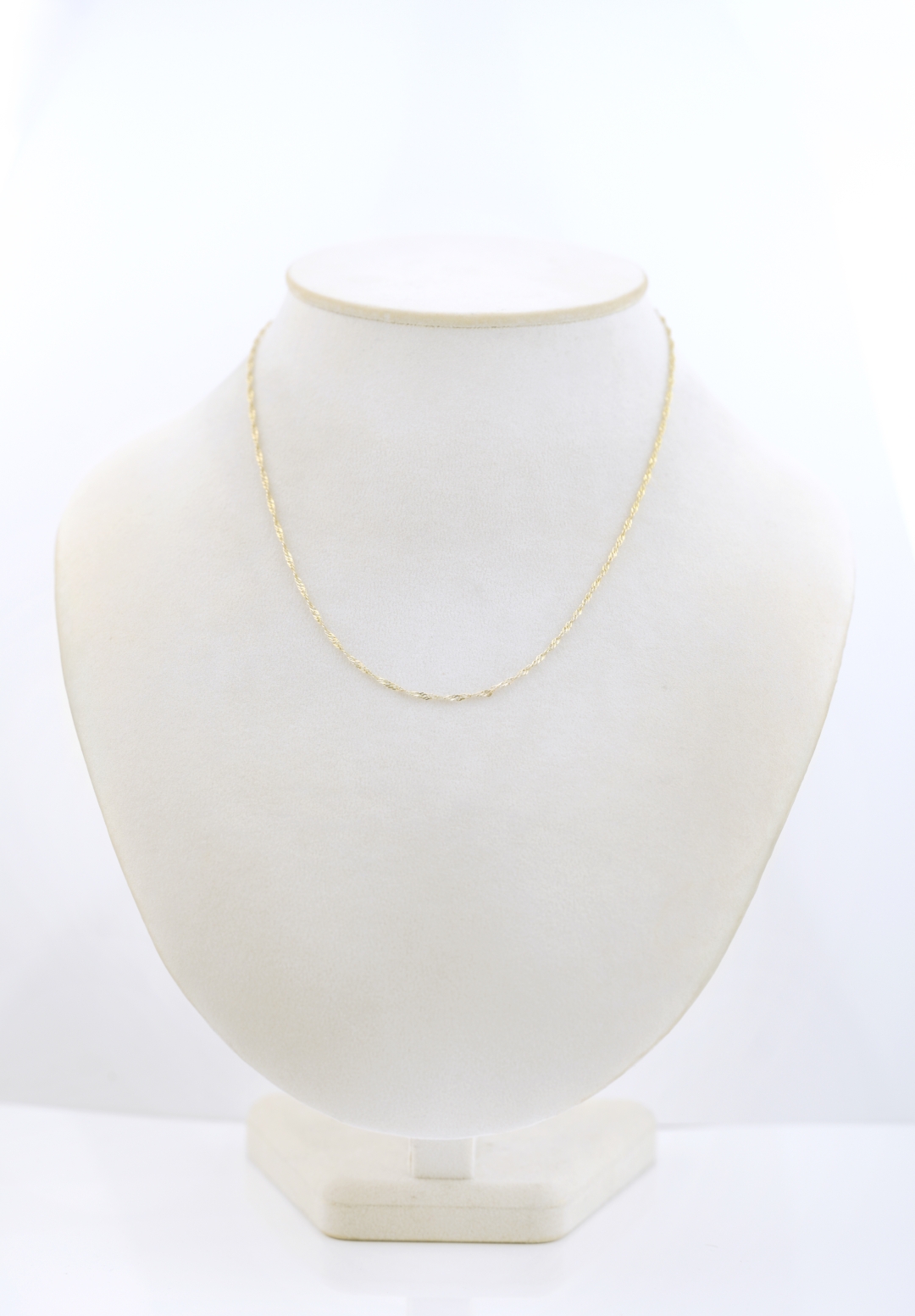 Řetízek tvoří drobné propletené články, které vytvářejí pravidelný kroucený vzor po celé délce. Zapíná se pomocí jednoduchého háčkového zapínání.