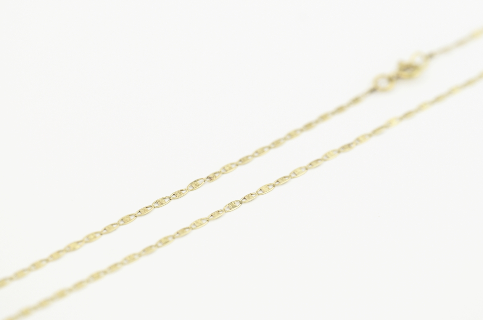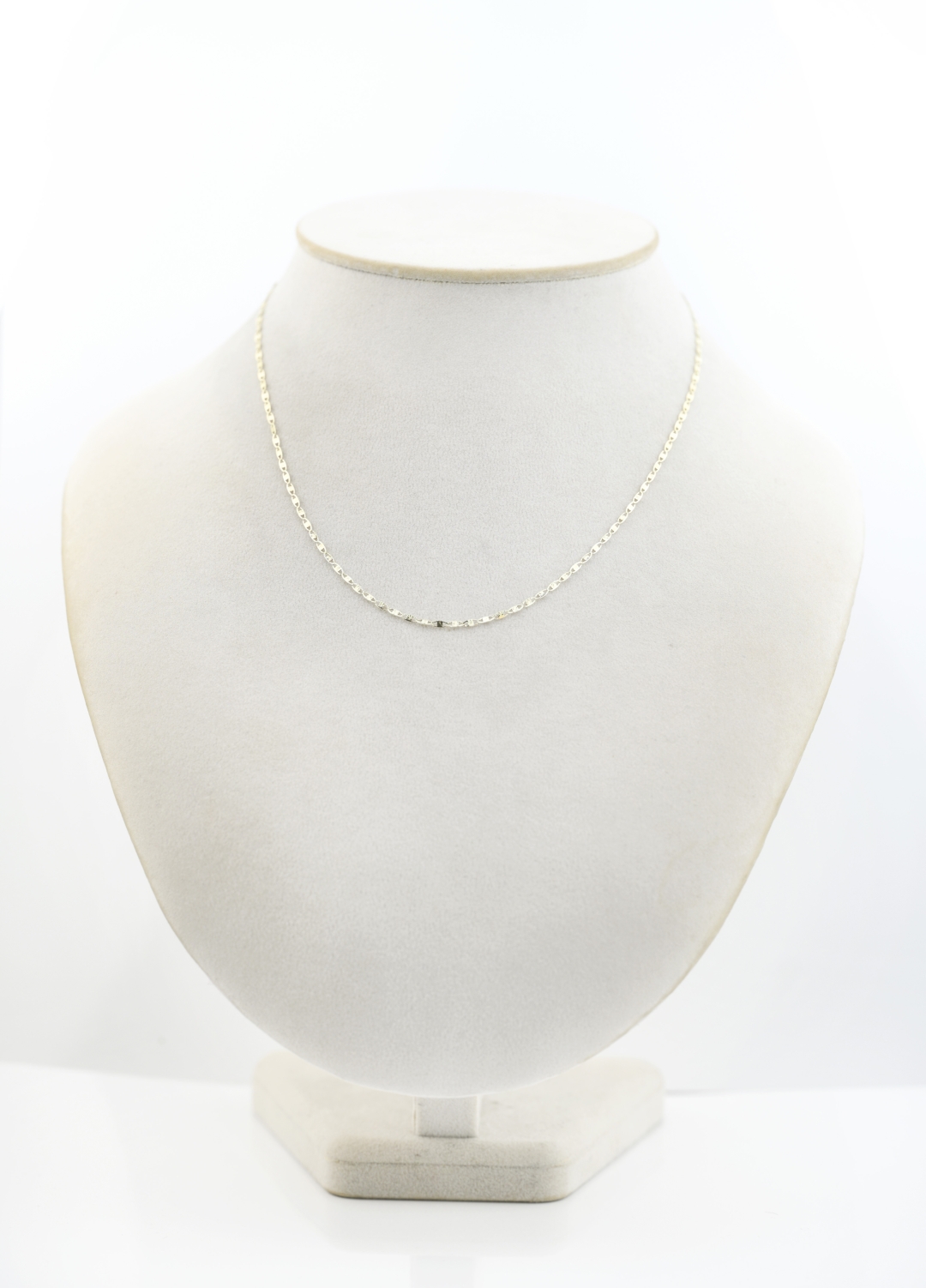 Řetízek je tvořen plochými oválnými články vzoru valentino, které lehce odrážejí světlo a dodávají mu jemný lesk.